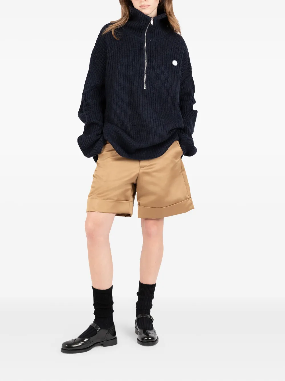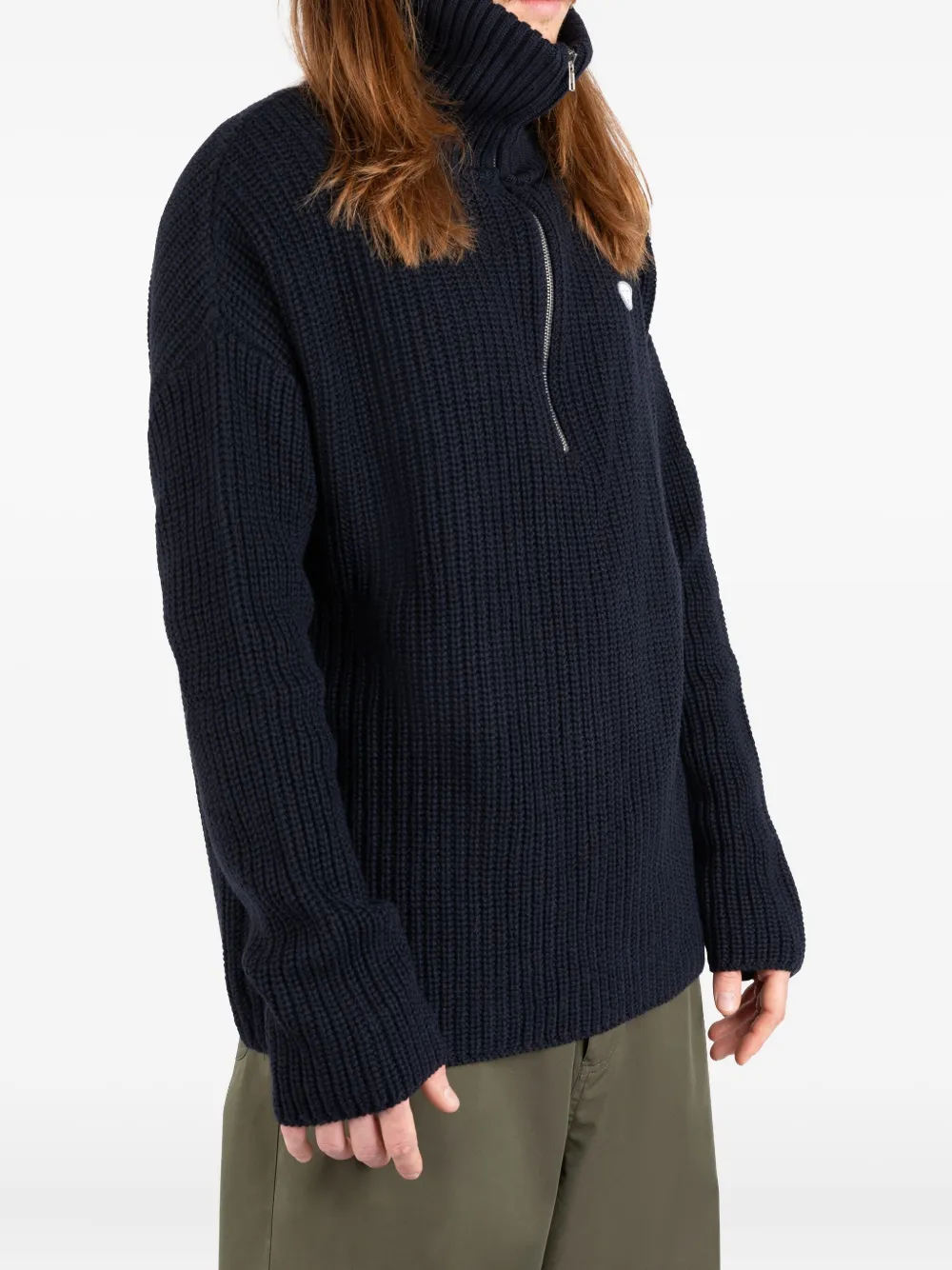 Темно-синяя ребристая трикотажная застежка-молния на половину длины, нашивка с логотипом и высоким воротом