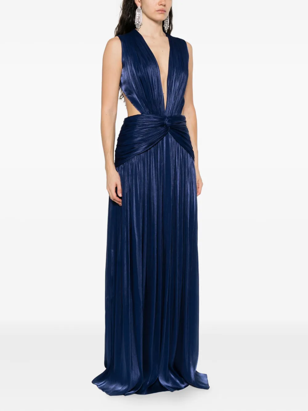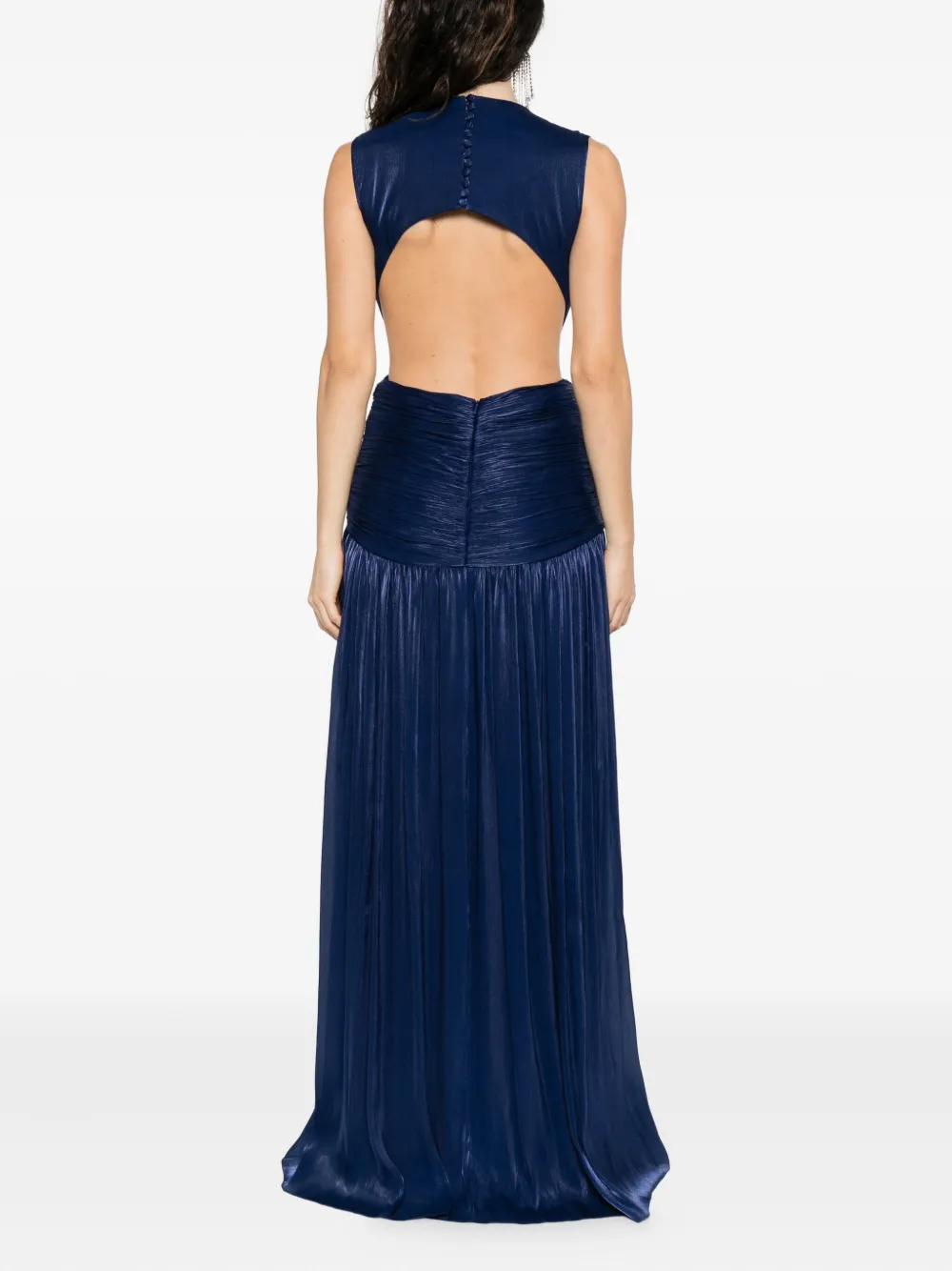 Темно-синяя плиссированная ткань с воротником-хомутиком без рукавов, вырез-замочная скважина сзади, присборенная талия