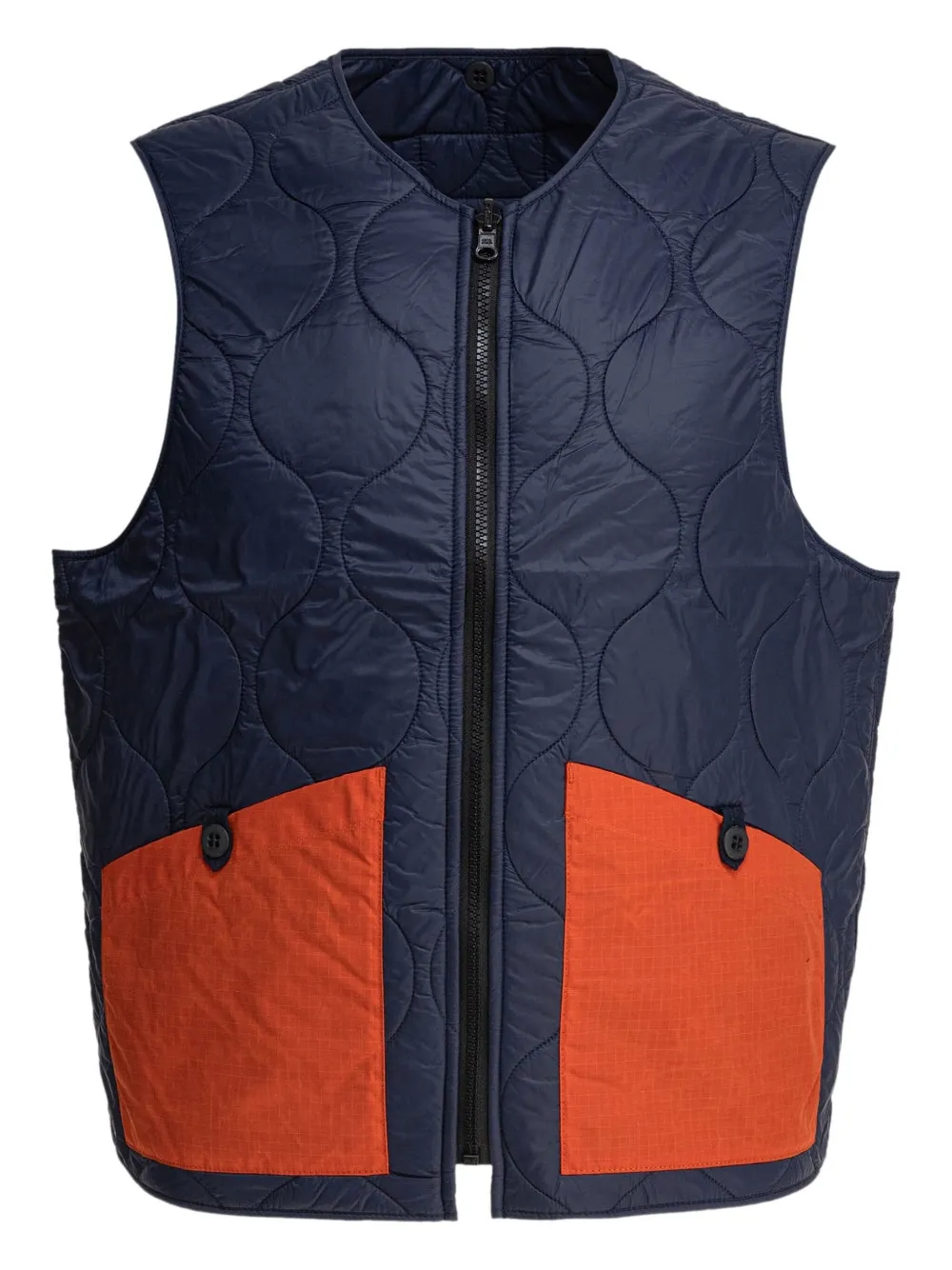 Темно-синий стеганый узор, застежка-молния, круглый вырез, два боковых кармана, двухцветный дизайн