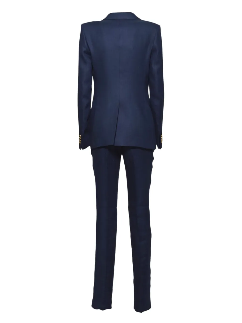 Темно-синий однобортный пиджак с золотистыми пуговицами, передние карманы, облегающие брюки