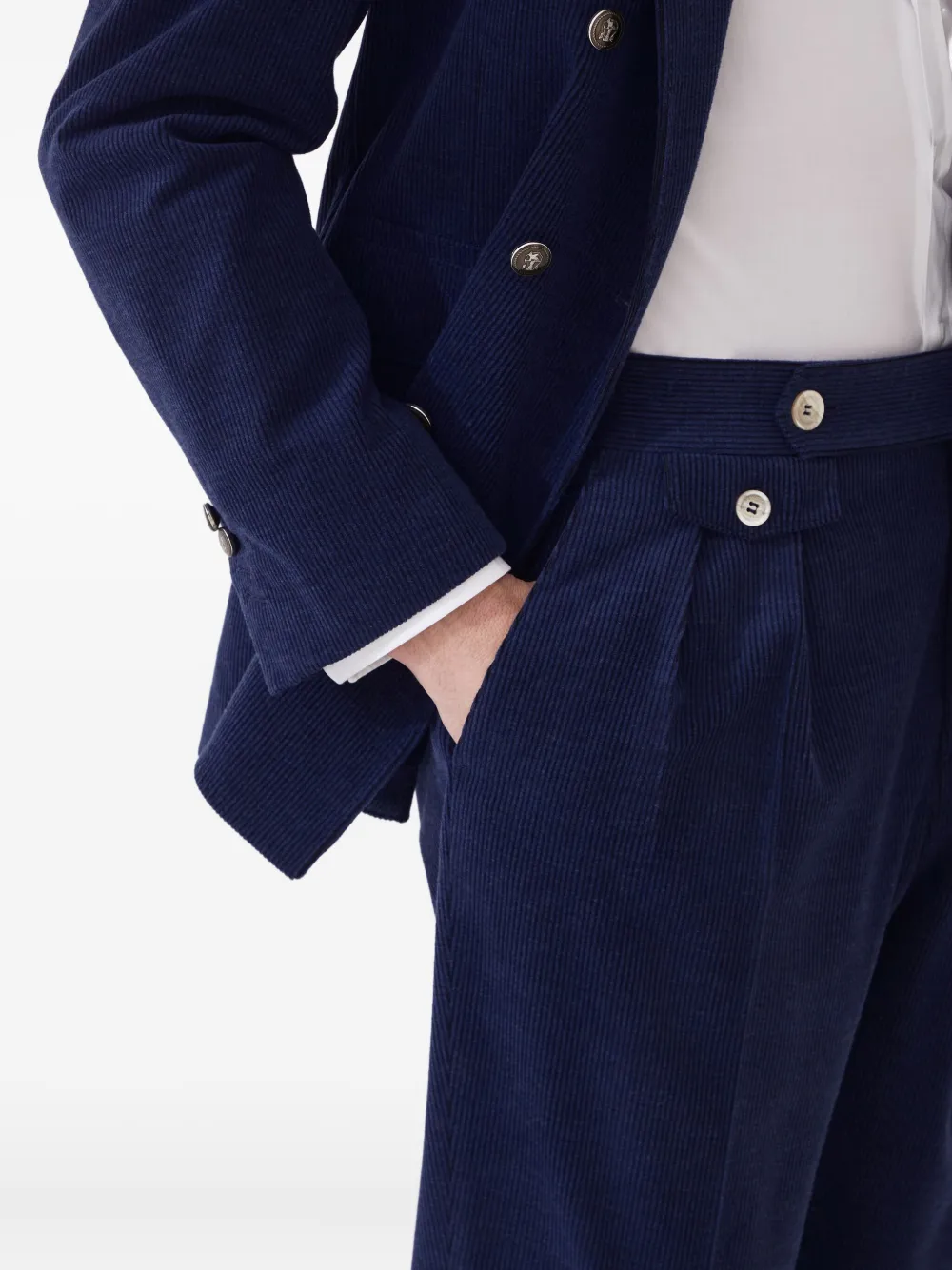 Темно-синие плиссированные передние боковые карманы, потайная застежка на пуговицы и гульфик