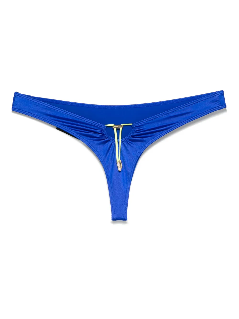 Плавки-стринги королевского синего цвета с завязкой на шнурке и выгравированным логотипом. Обязательно примеряйте купальники поверх своей одежды.