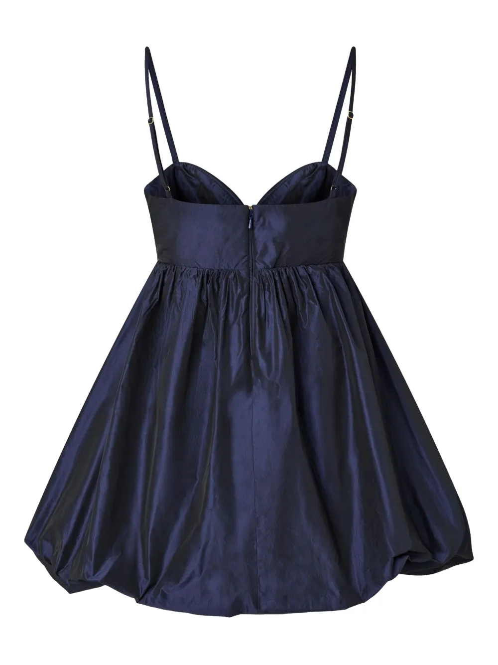 Темно-синий вырез в форме сердечка, пышный подол, тонкие бретели, потайная застежка-молния, присборенная талия