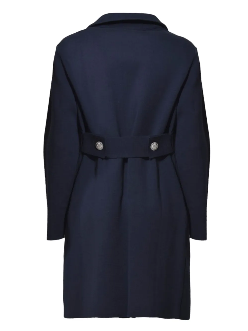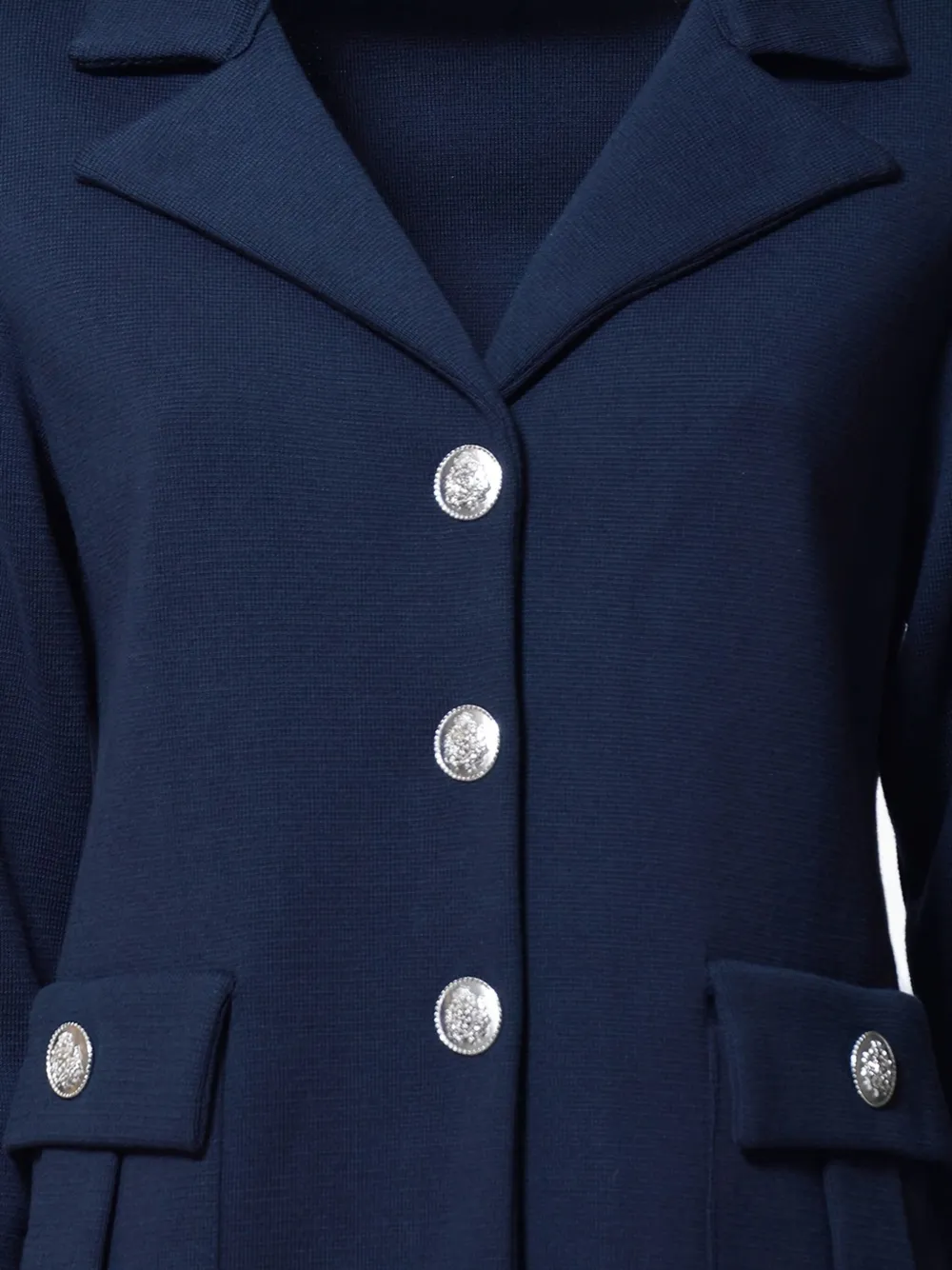 Темно-синего цвета, застежка на пуговицы спереди, клапан, боковые карманы, длинные рукава