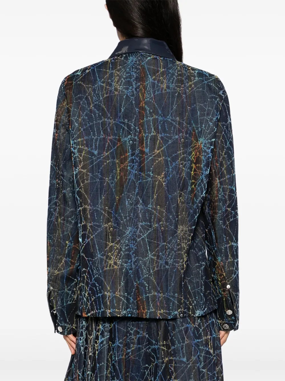 Застежка на пуговицы спереди цвета индиго, два накладных кармана на груди, два накладных кармана спереди, рукава с застегивающимися манжетами