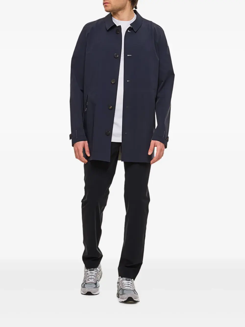 Темно-синие пуговицы спереди, большие пуговицы, боковые карманы с листочкой, классический воротник, регулируемые манжеты
