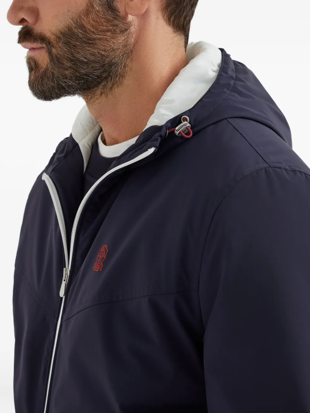 Темно-синяя застежка-молния спереди, капюшон на шнурке, вышитый логотип на груди, два боковых кармана на молнии, эластичные манжеты