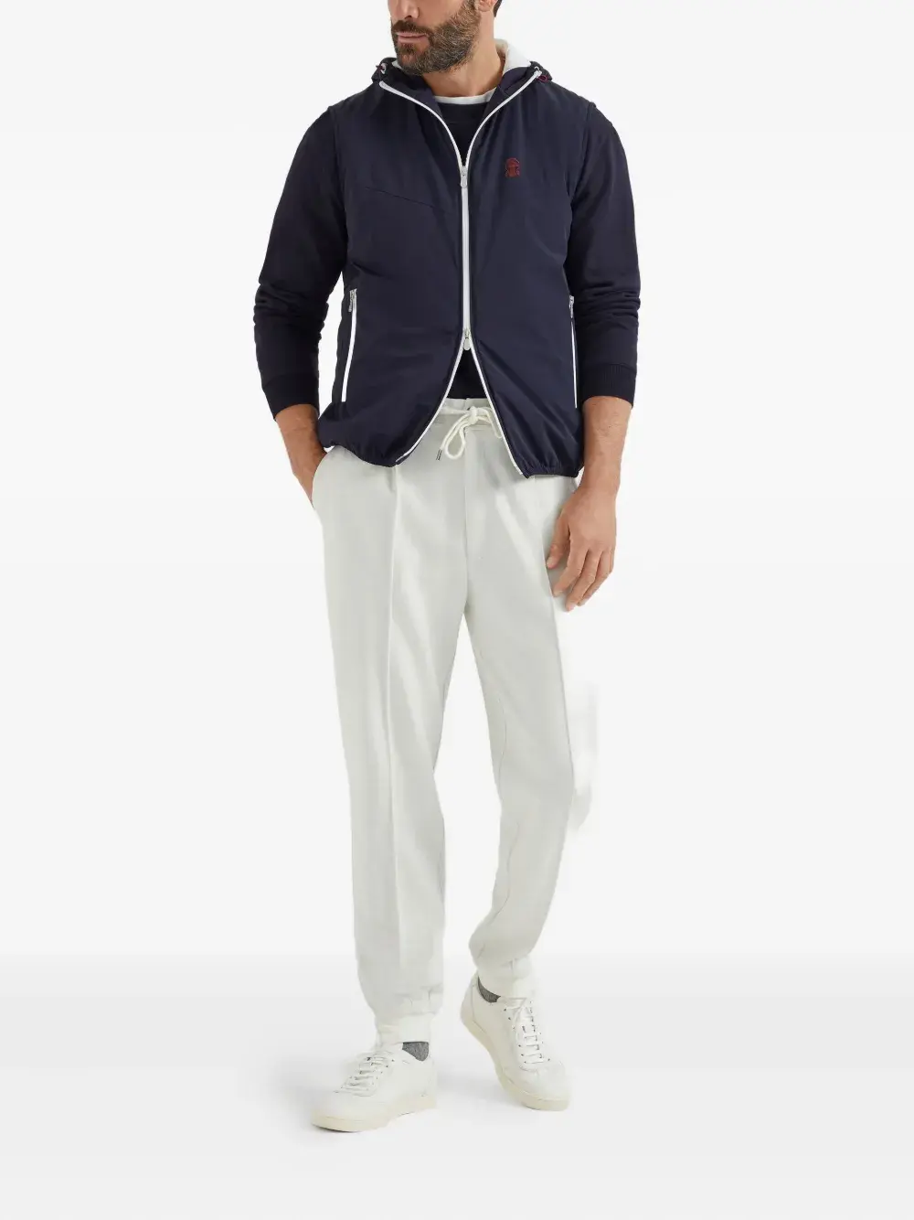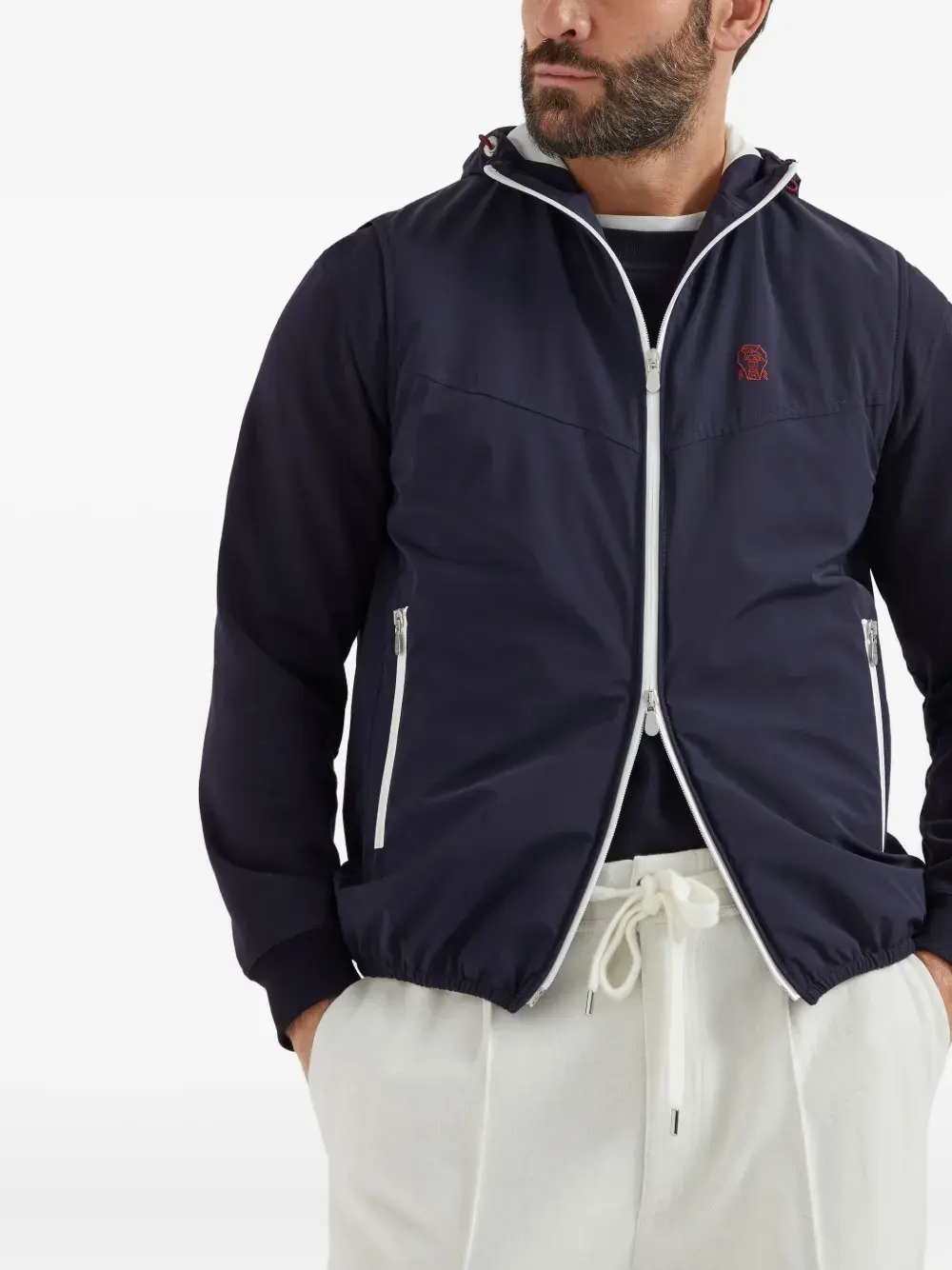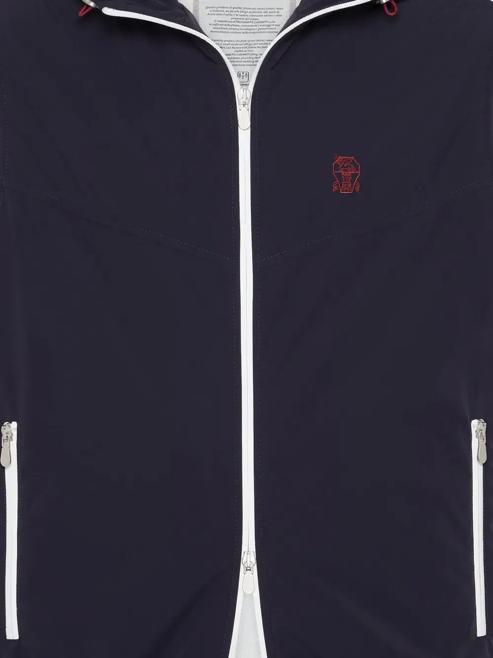 Застежка-молния темно-синего цвета спереди, вышитый логотип на груди, капюшон без рукавов на завязках, боковые карманы на молнии