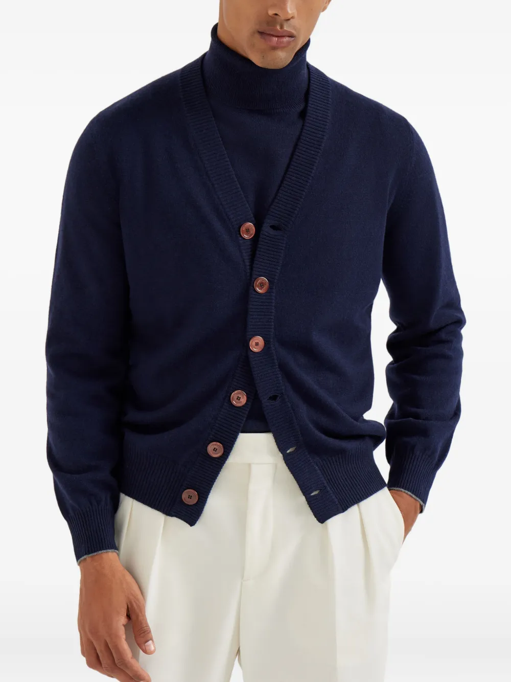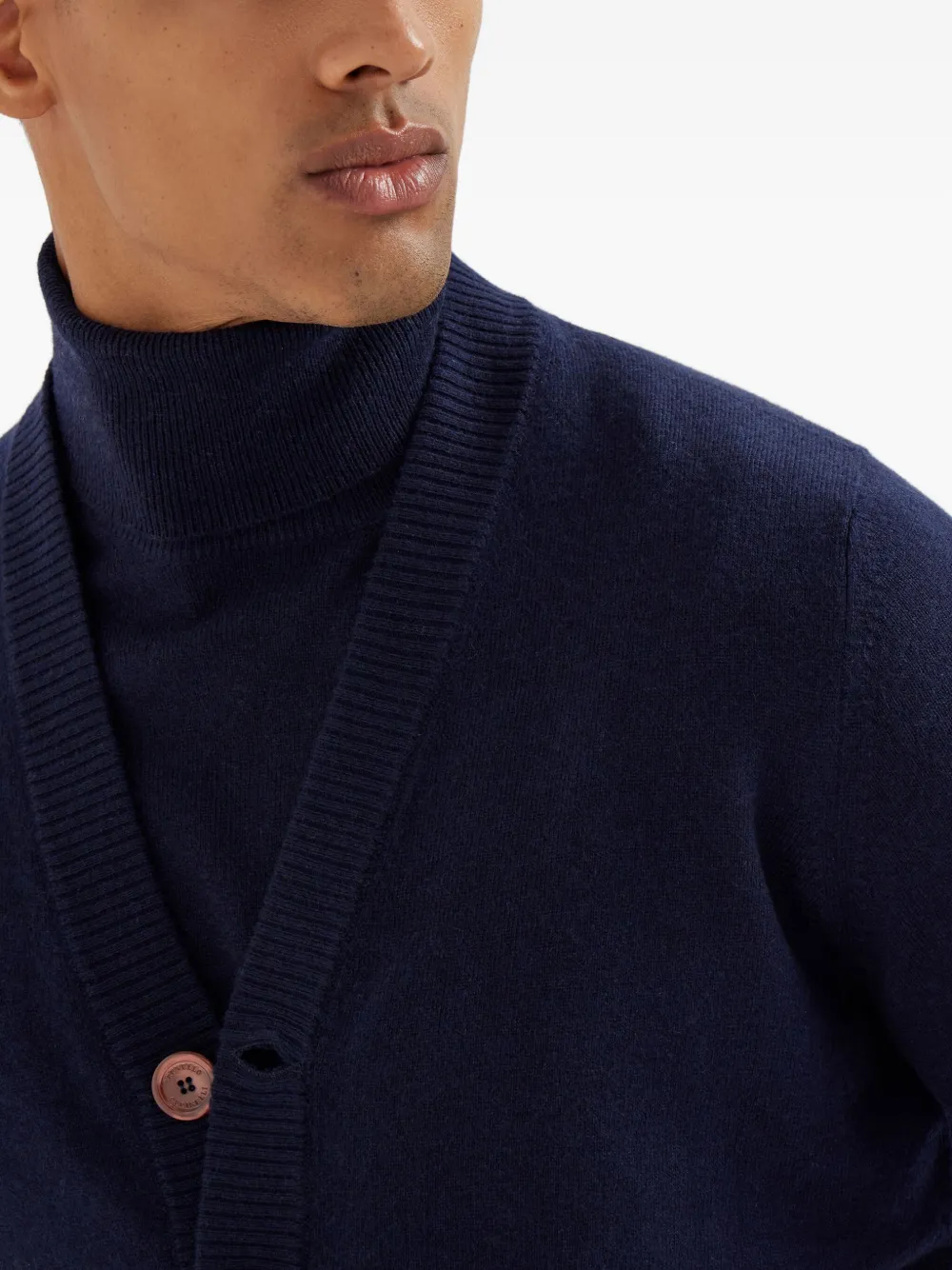 Темно-синий V-образный вырез, застежка на пуговицы спереди, ребристые манжеты и подол, длинные рукава