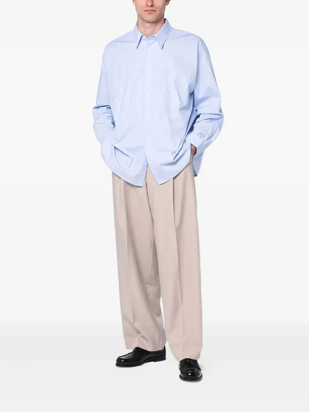 Светло-голубой вышитый логотип, воротник на пуговицах, длинные рукава, прямой подол