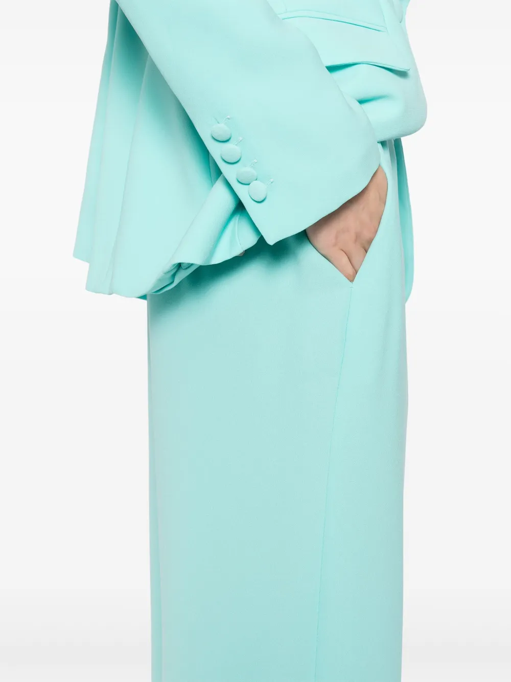 Бирюзовая потайная застежка на пуговицу, крючок и молнию спереди, два прорезных кармана по бокам