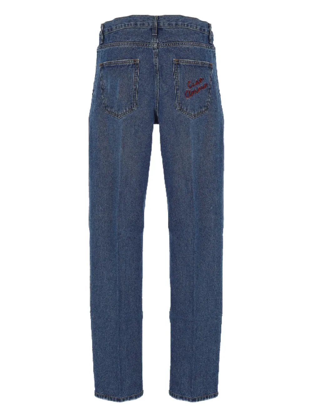 Синяя вышитая деталь, пять карманов, застежка на пуговицы, прямой крой, высокая талия