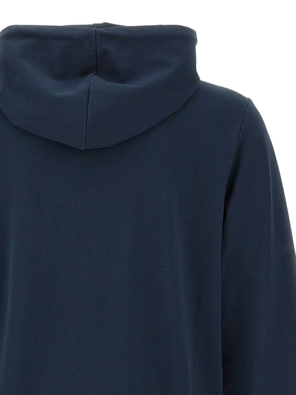 Темно-синий логотип на груди, затягивающийся шнурок, капюшон, застежка-молния, боковые карманы