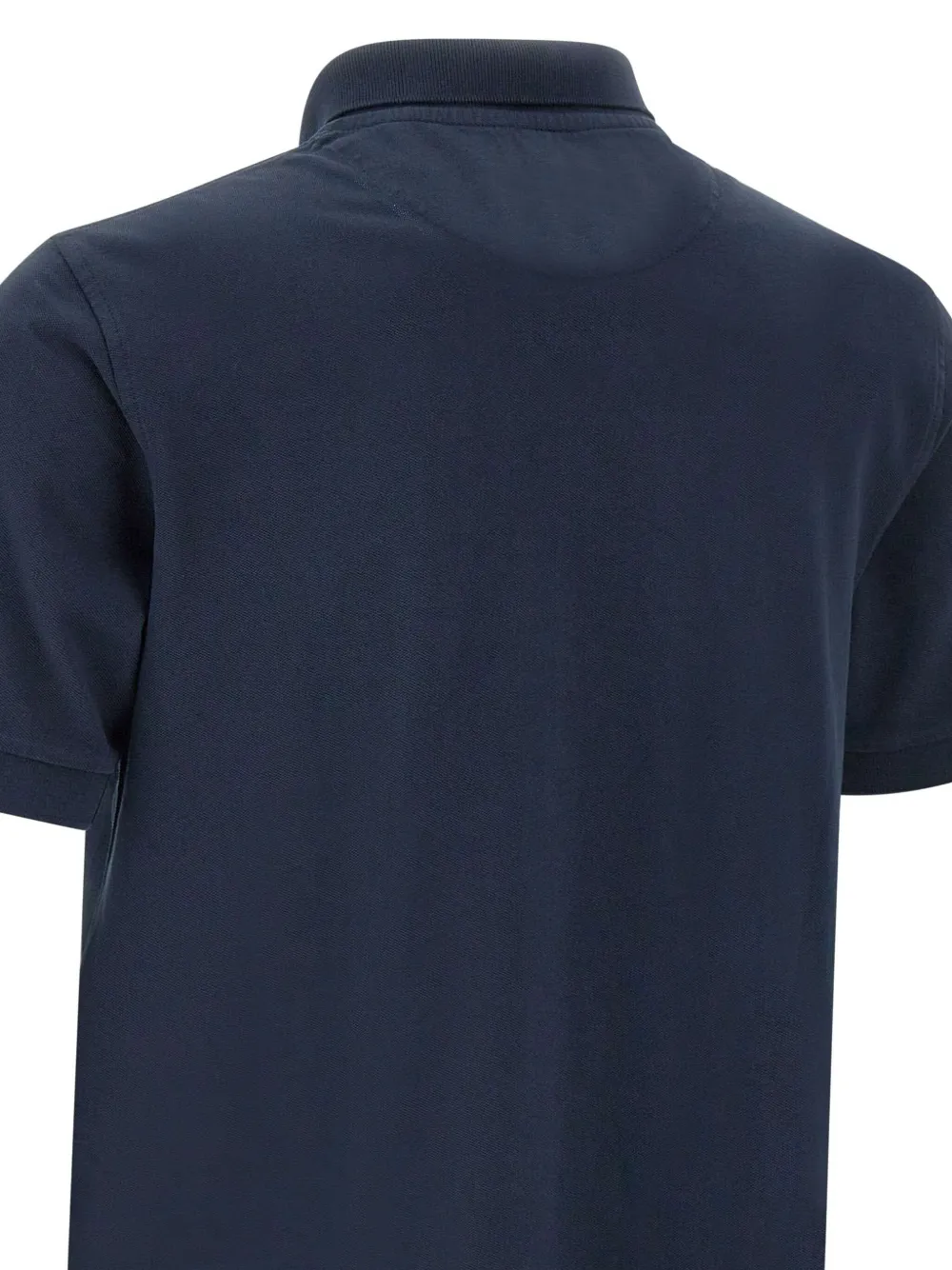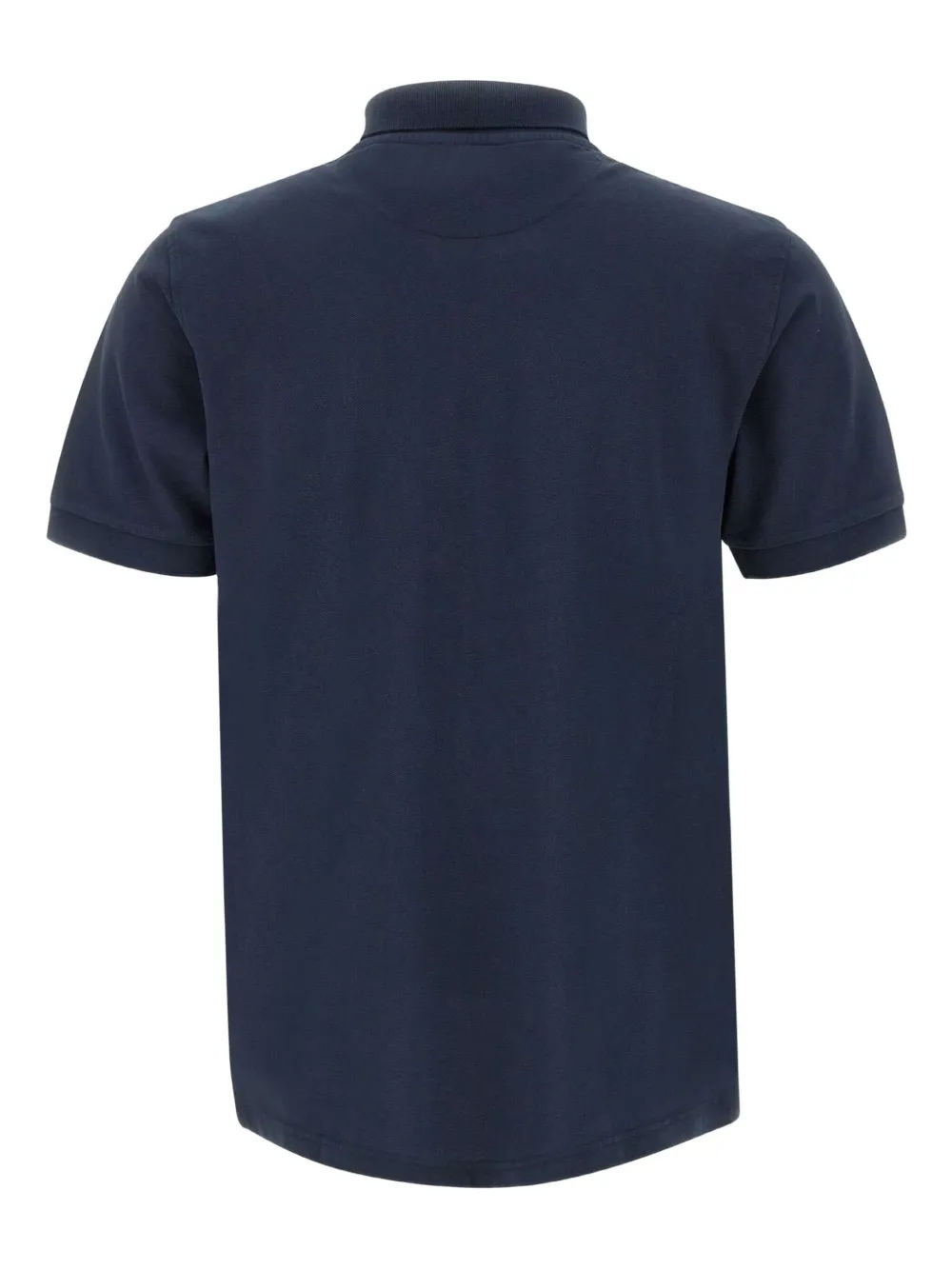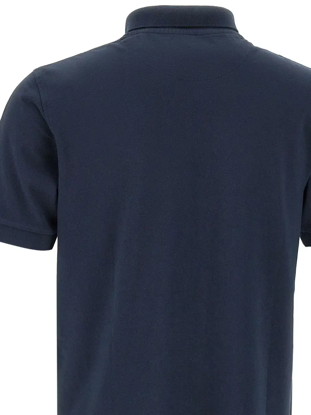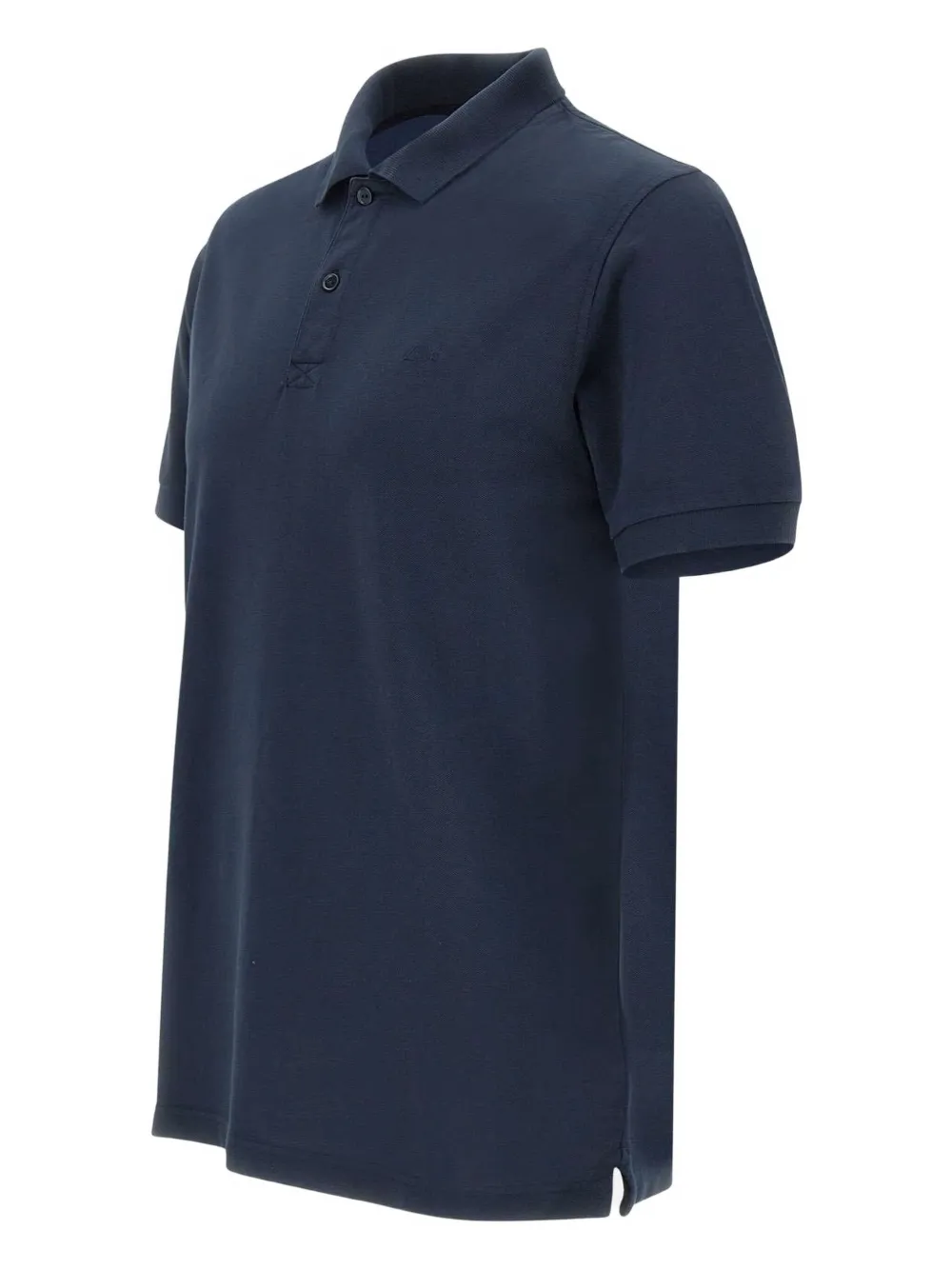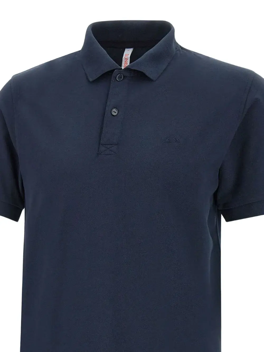 Темно-синий классический воротник, застежка на три пуговицы, короткие рукава, боковые разрезы