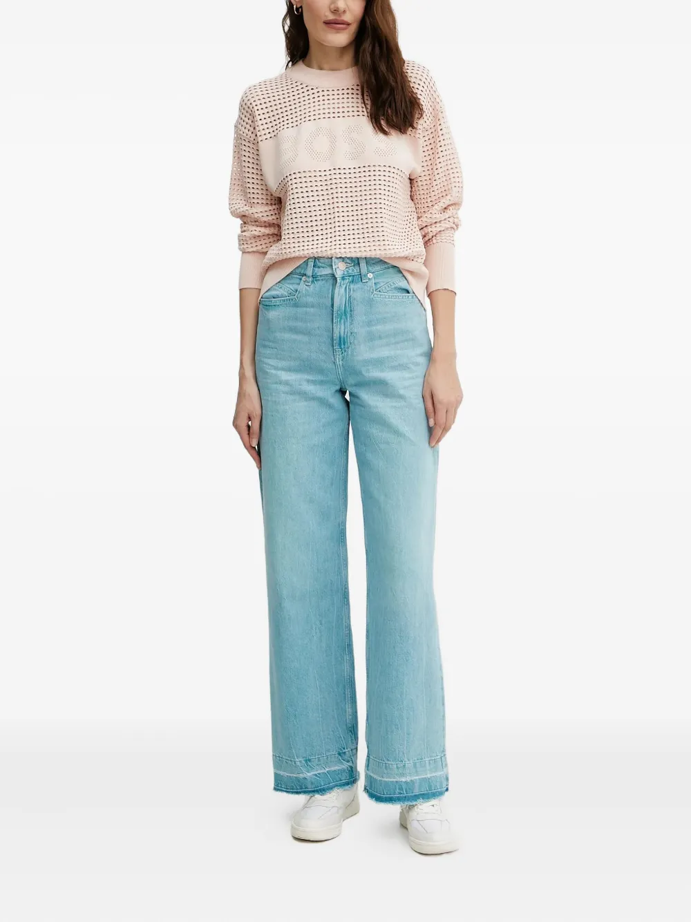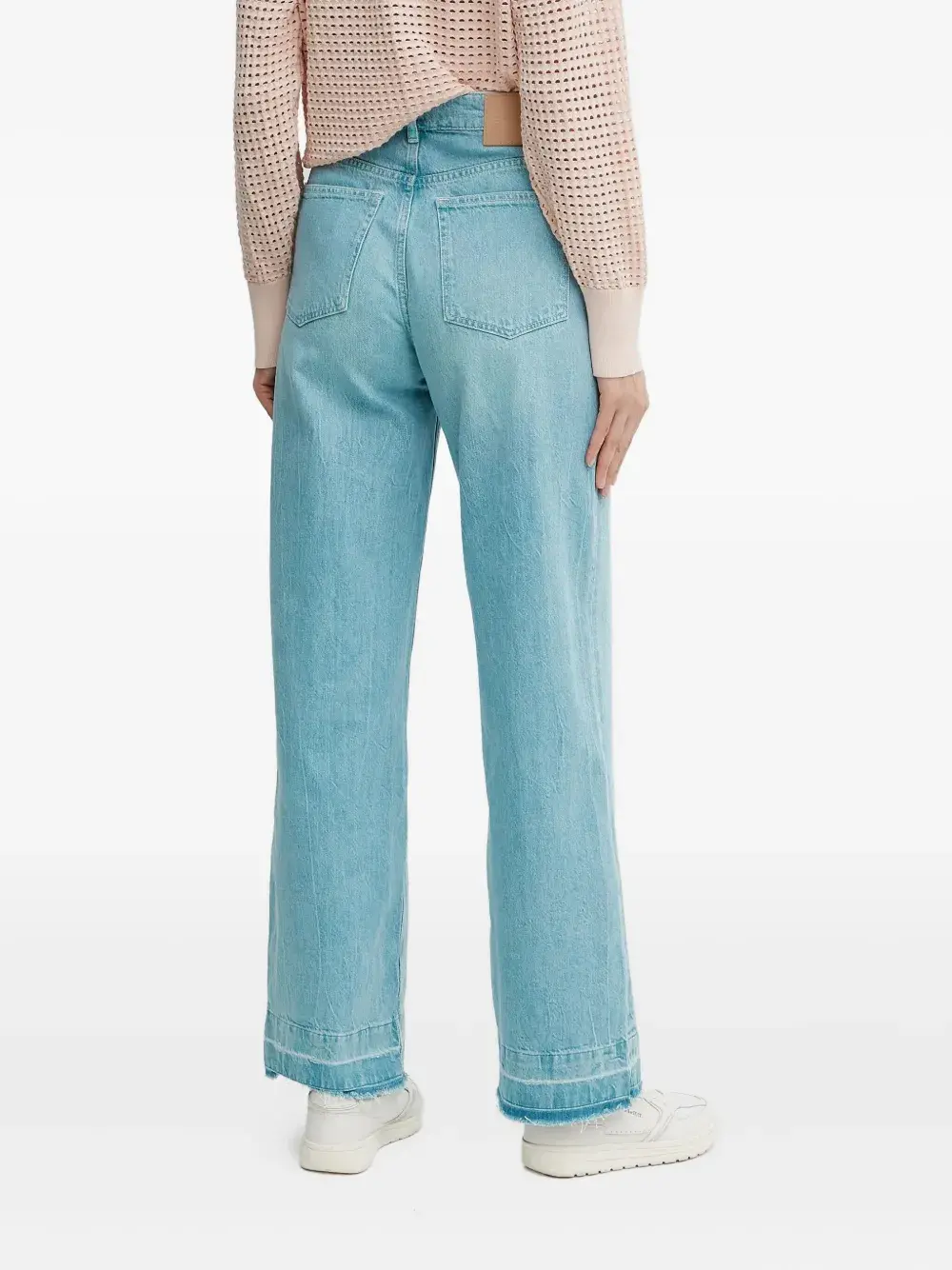 Светло-голубой бахромчатый край, высокая талия, классические пять карманов, пуговицы, гульфик, шлевки для ремня
