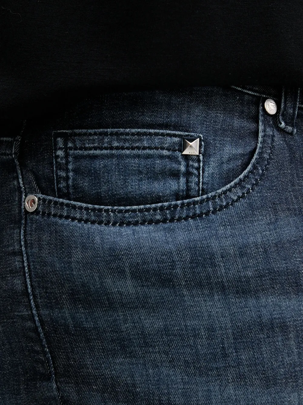 Темно-синий фасон с пятью карманами, потайная застежка на пуговицы и ширинку, прямые шлевки для ремня