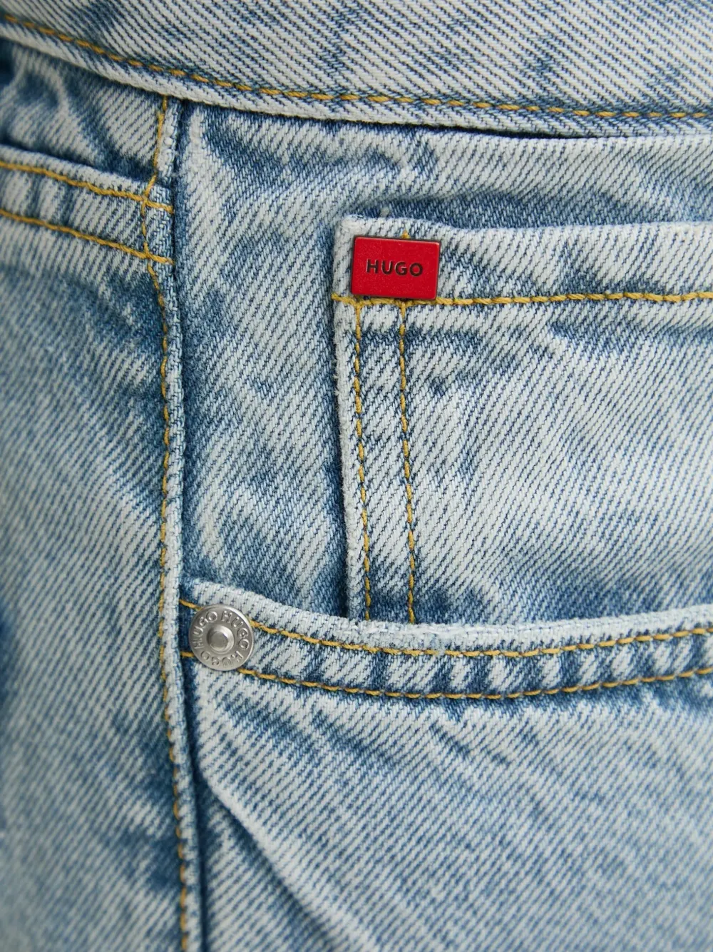 Светло-голубой с потертой отделкой, с красной нашивкой-логотипом, с пятью карманами, застежкой на пуговицы