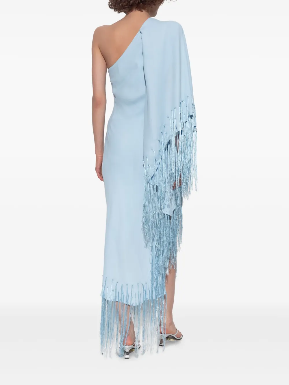 Светло-голубой асимметричный подол, каскадная бахрома, дизайн на одно плечо, боковой разрез
