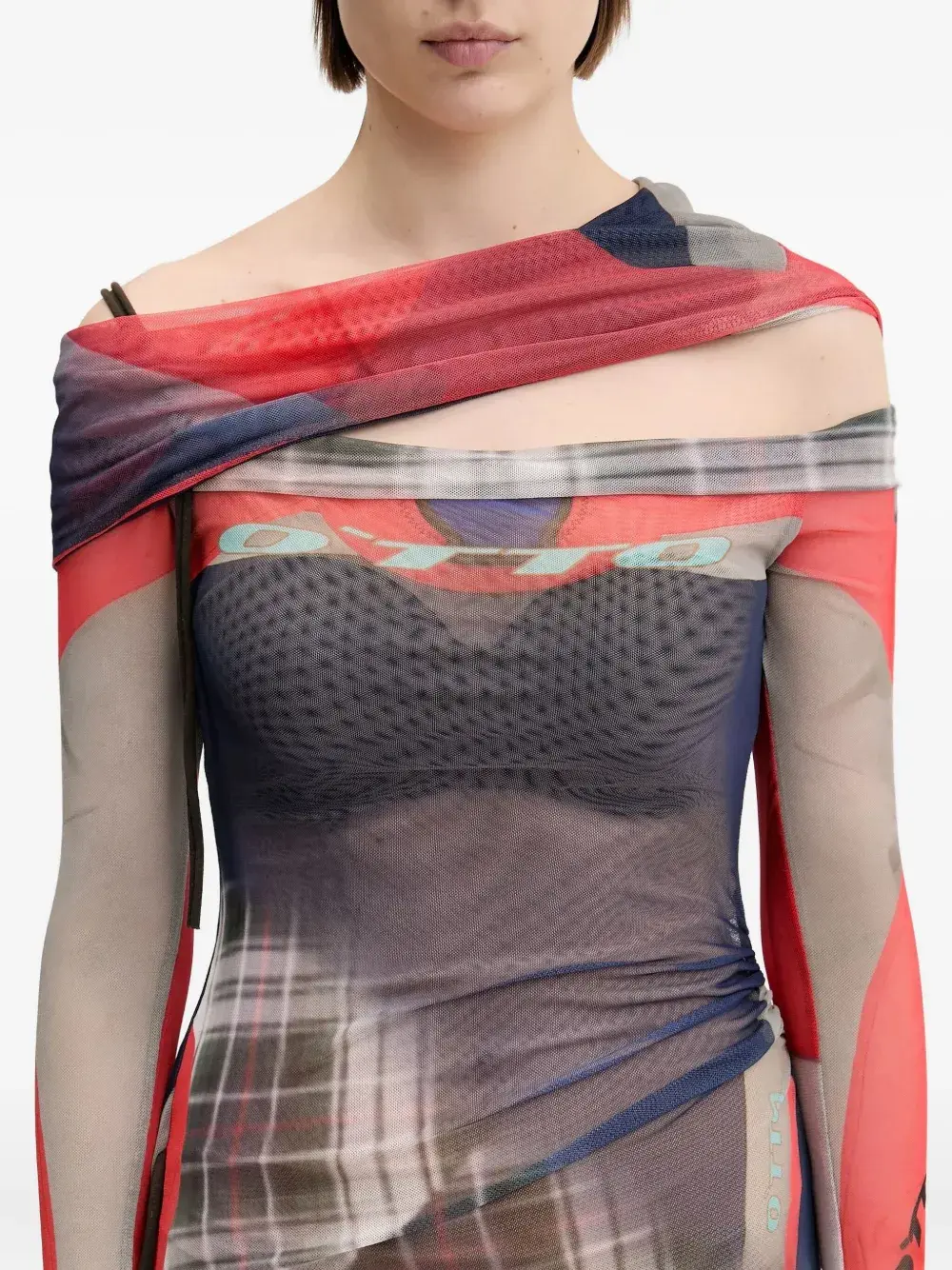 Синяя сетчатая вставка, клетчатый узор, воротник-хомут, асимметричный подол, затягивающийся шнурком