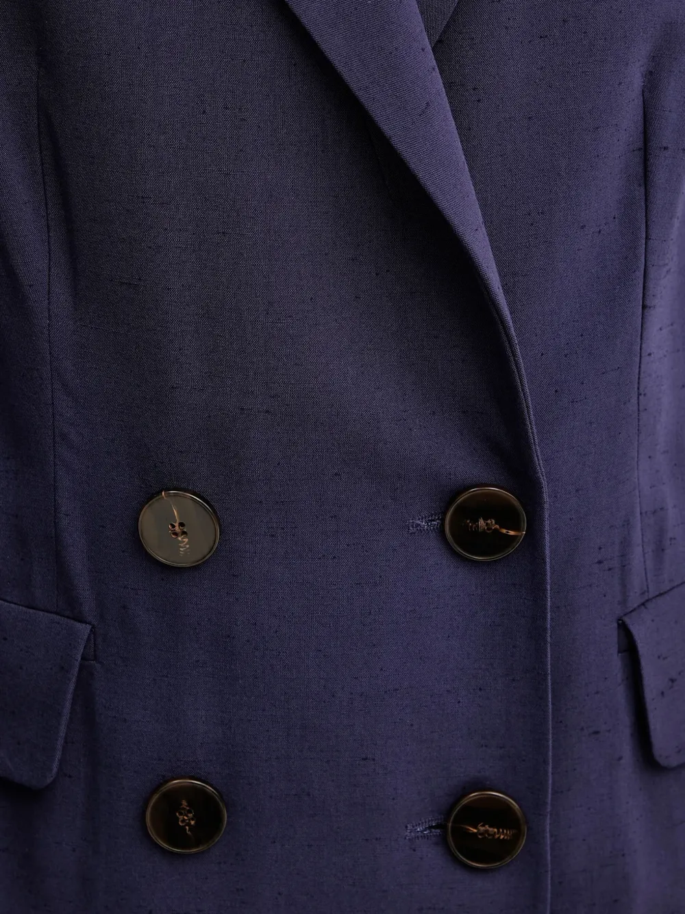 Темно-синий двубортный пиджак, застежка на пуговицы с выемкой на лацкане, прямой подол