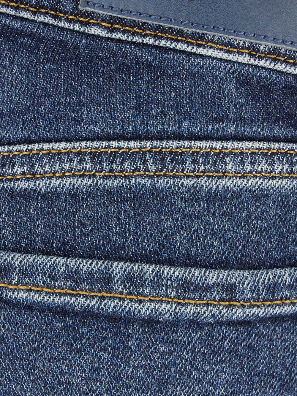 Темно-синяя кожаная нашивка с отстрочкой, пять карманов, стильные пуговицы, шлевки для ремня