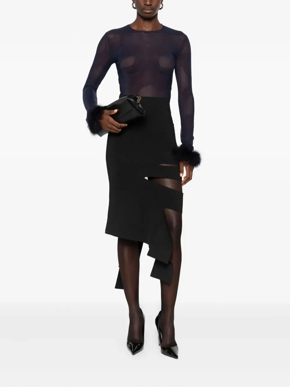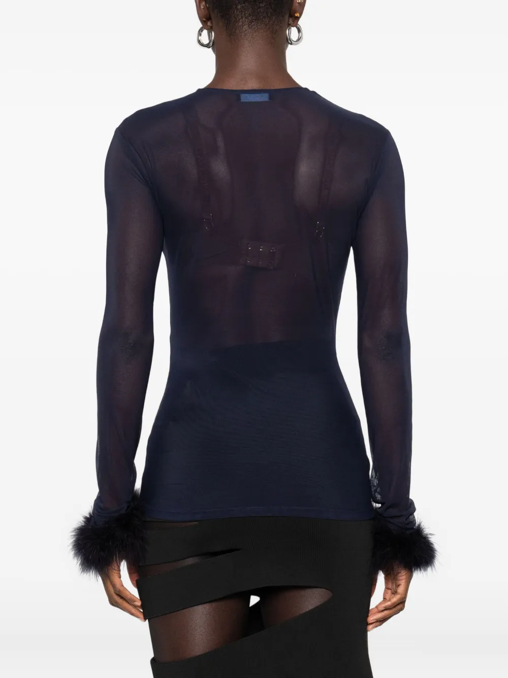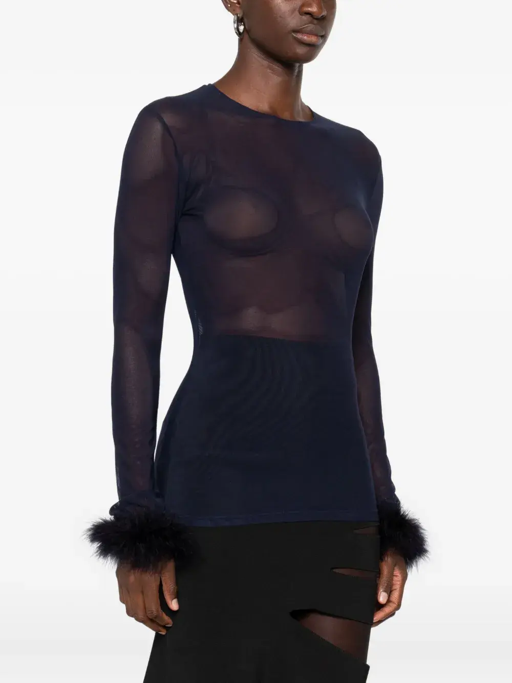 Сетчатая ткань чернильно-синего цвета с длинными рукавами, круглым вырезом и манжетами из перьев