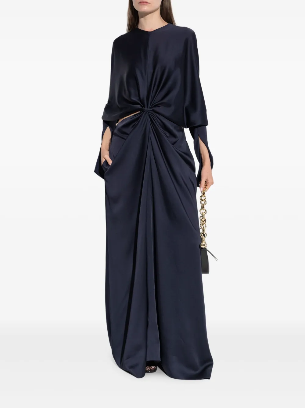 Темно-синяя атласная ткань с драпировкой, скрученная деталь, длинные рукава, разрезы по бокам