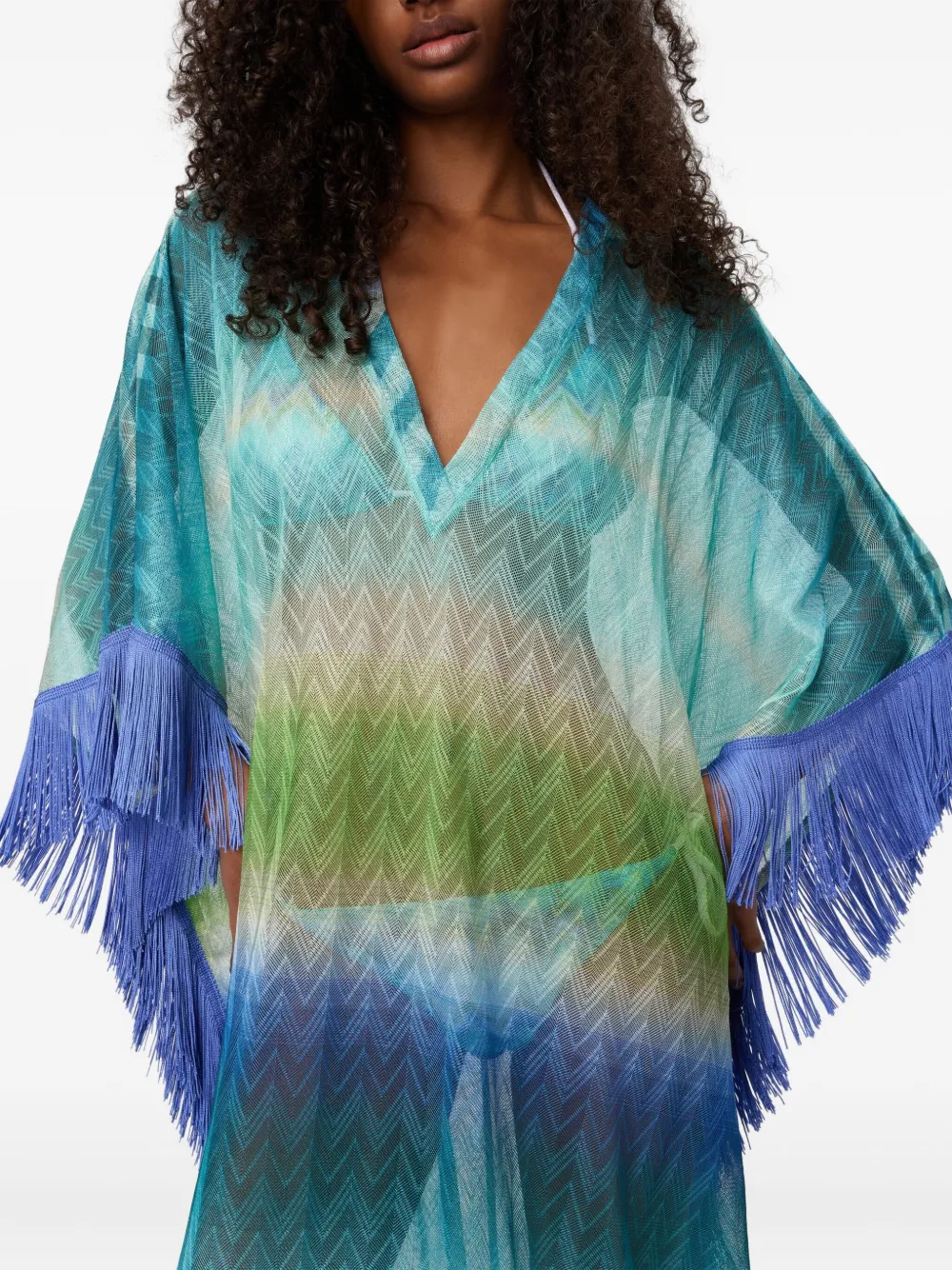 Синий V-образный вырез с бахромой и эффектом омбре. Полученный вами товар может немного отличаться от представленного на фотографии. Это связано с тем, что все изделия Missoni изготавливаются вручную.