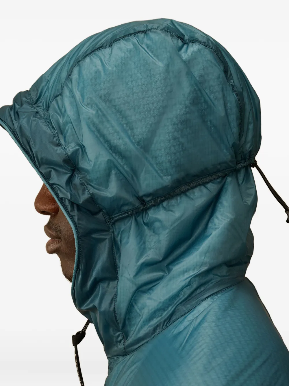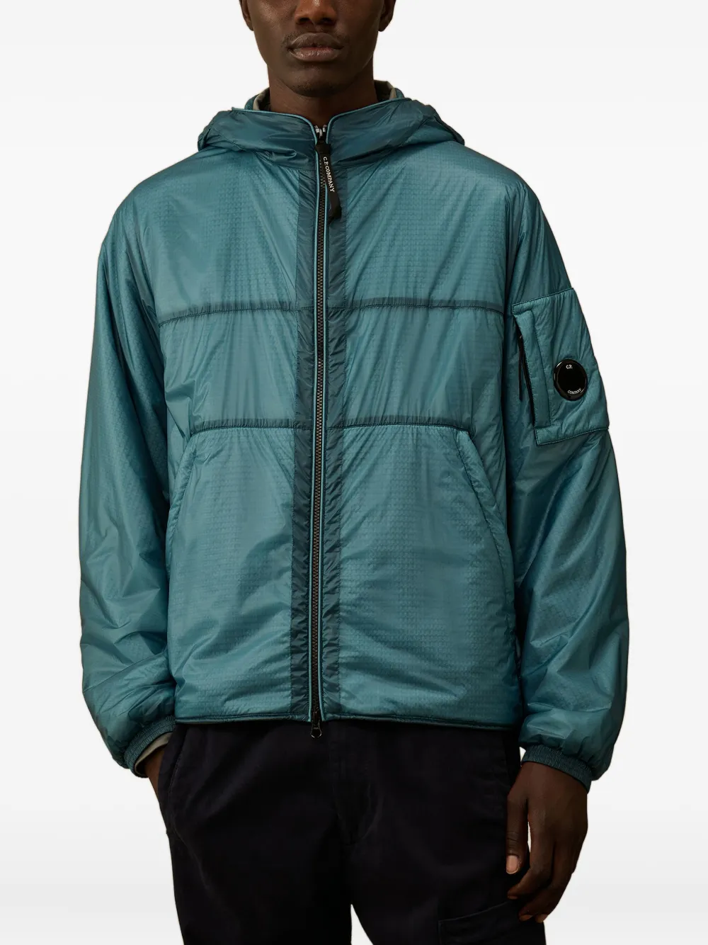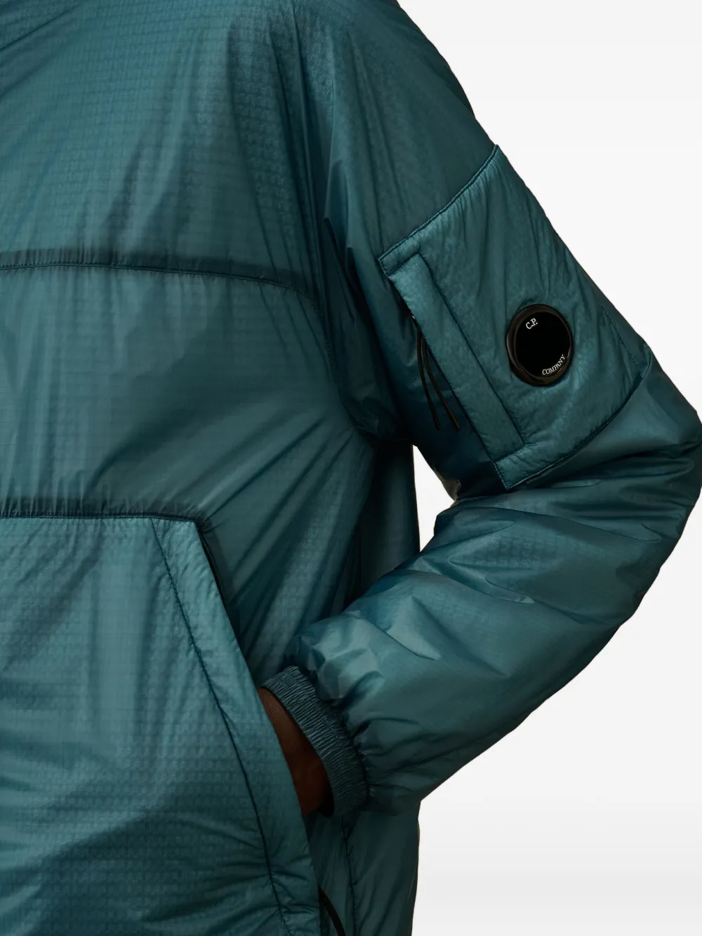 Синяя стеганая модель, капюшон, вырез на молнии, накладной карман, мягкая конструкция. Компания CP Company рекомендует снимать все съемные аксессуары перед стиркой.