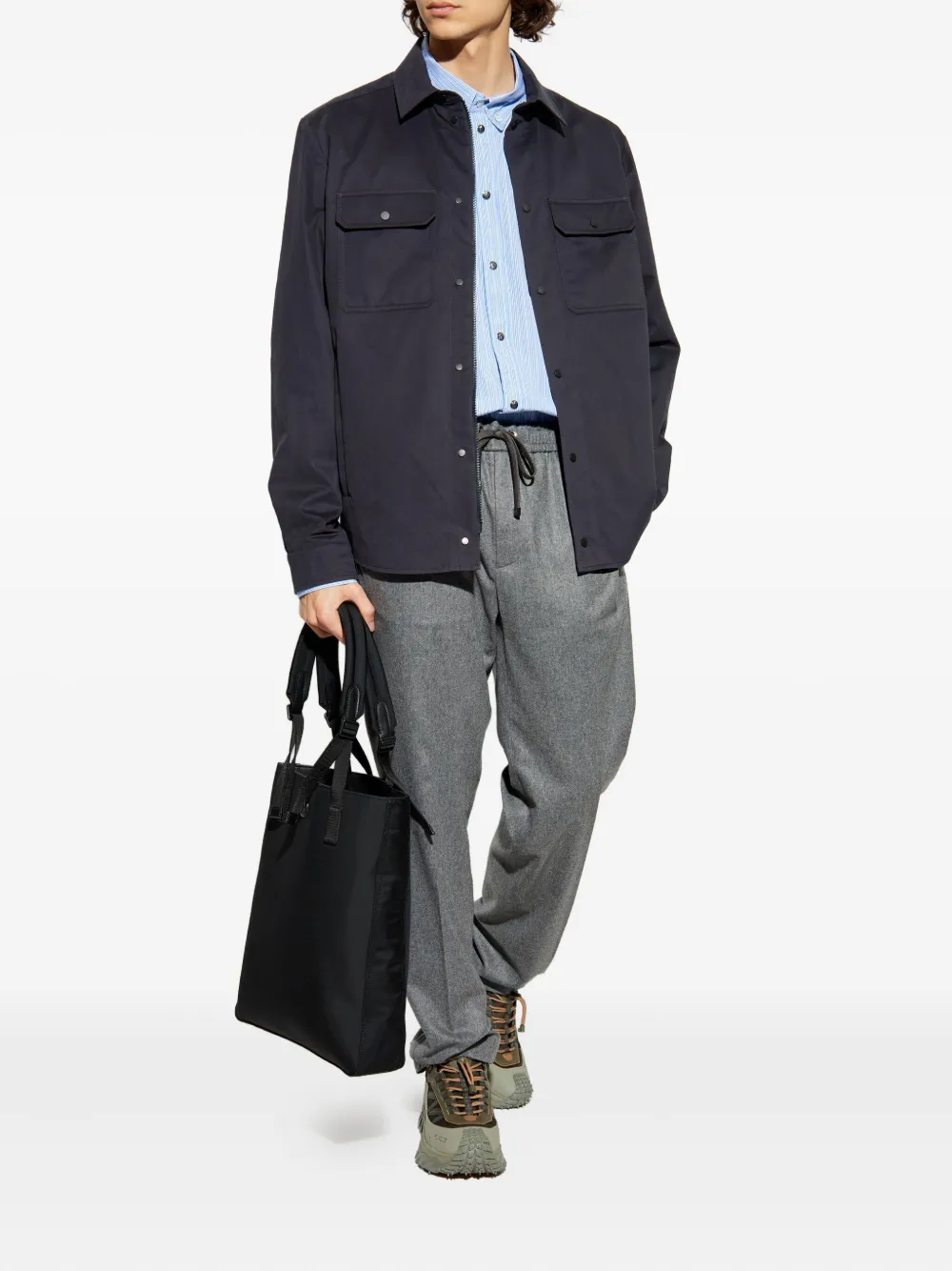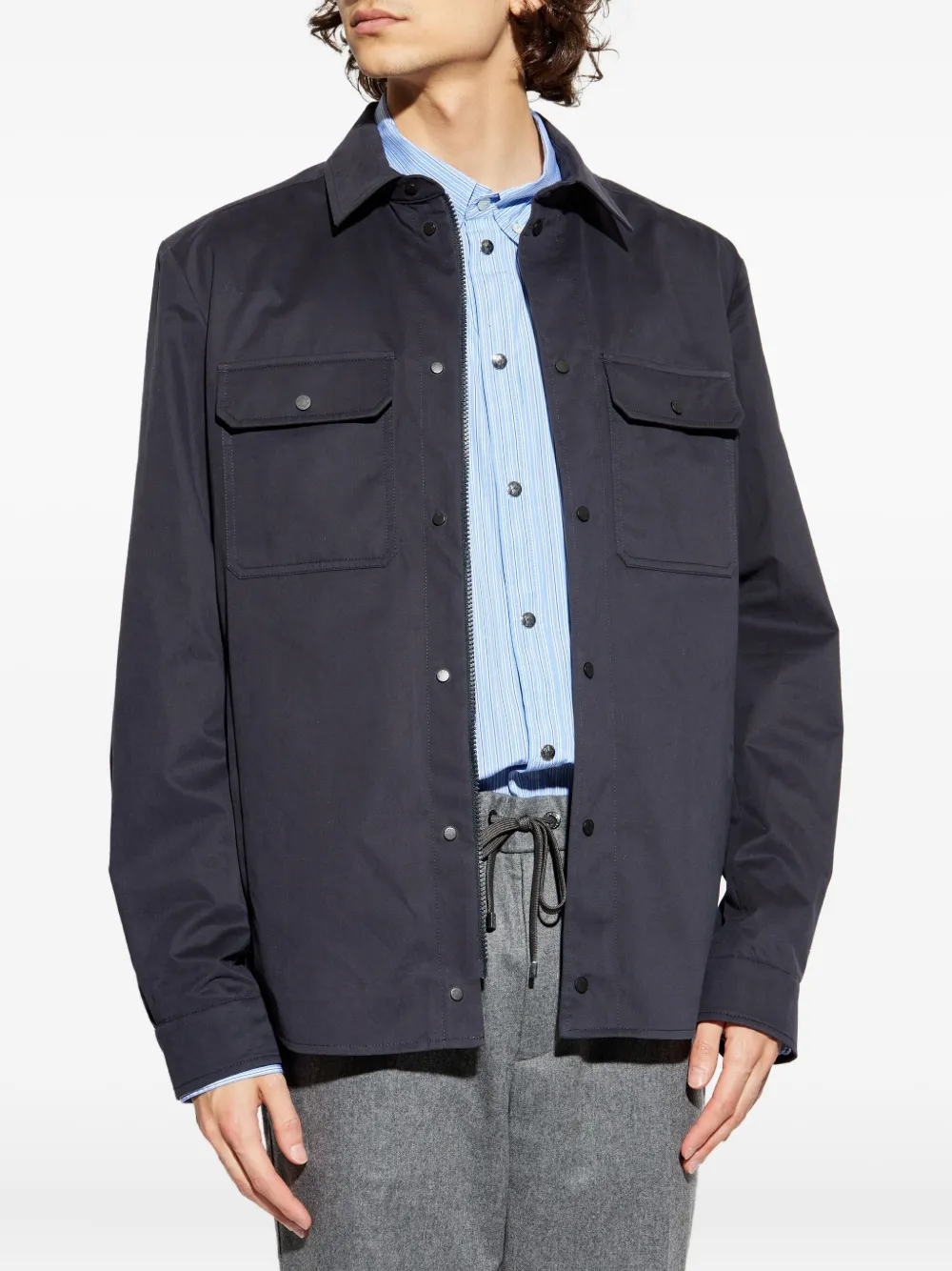 Темно-синяя застежка на пуговицы спереди, два нагрудных кармана с клапанами, длинные рукава, нашивка с логотипом