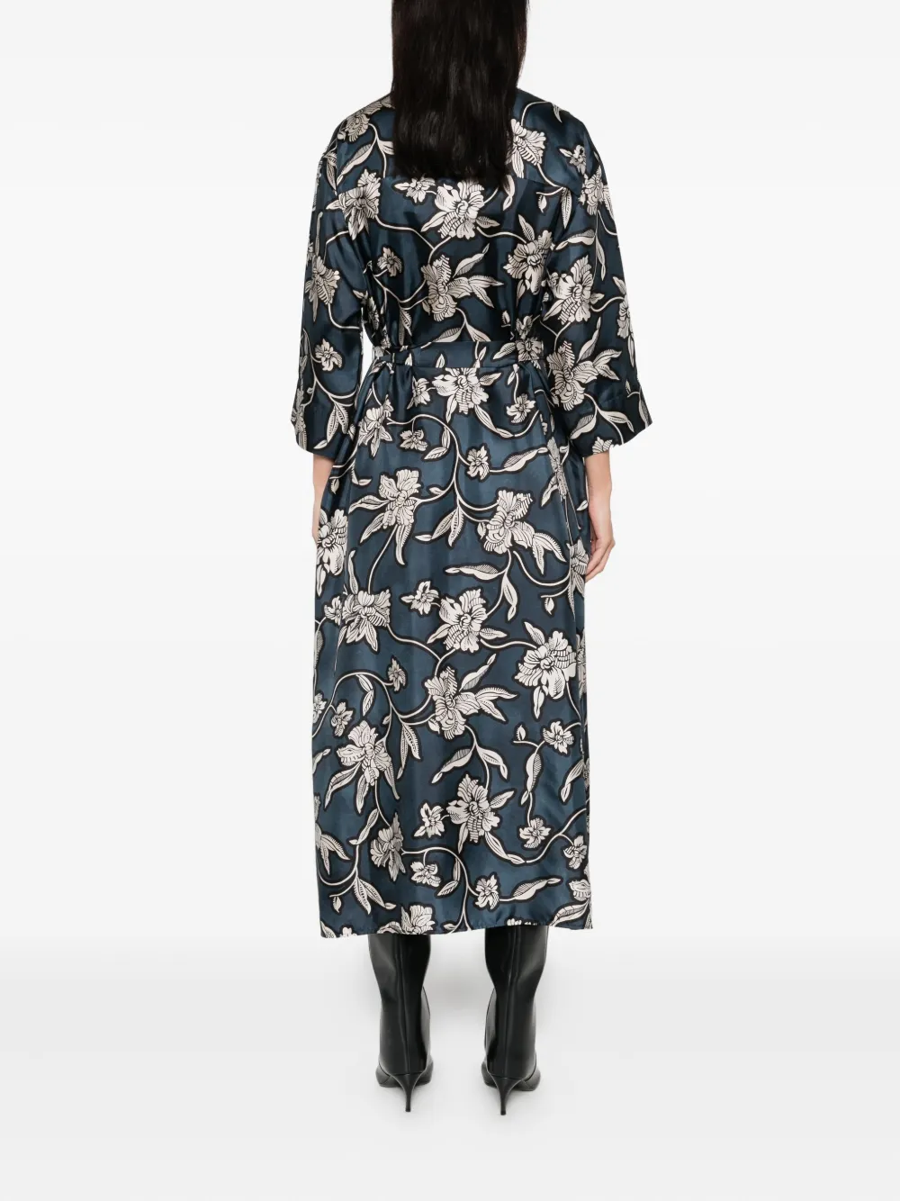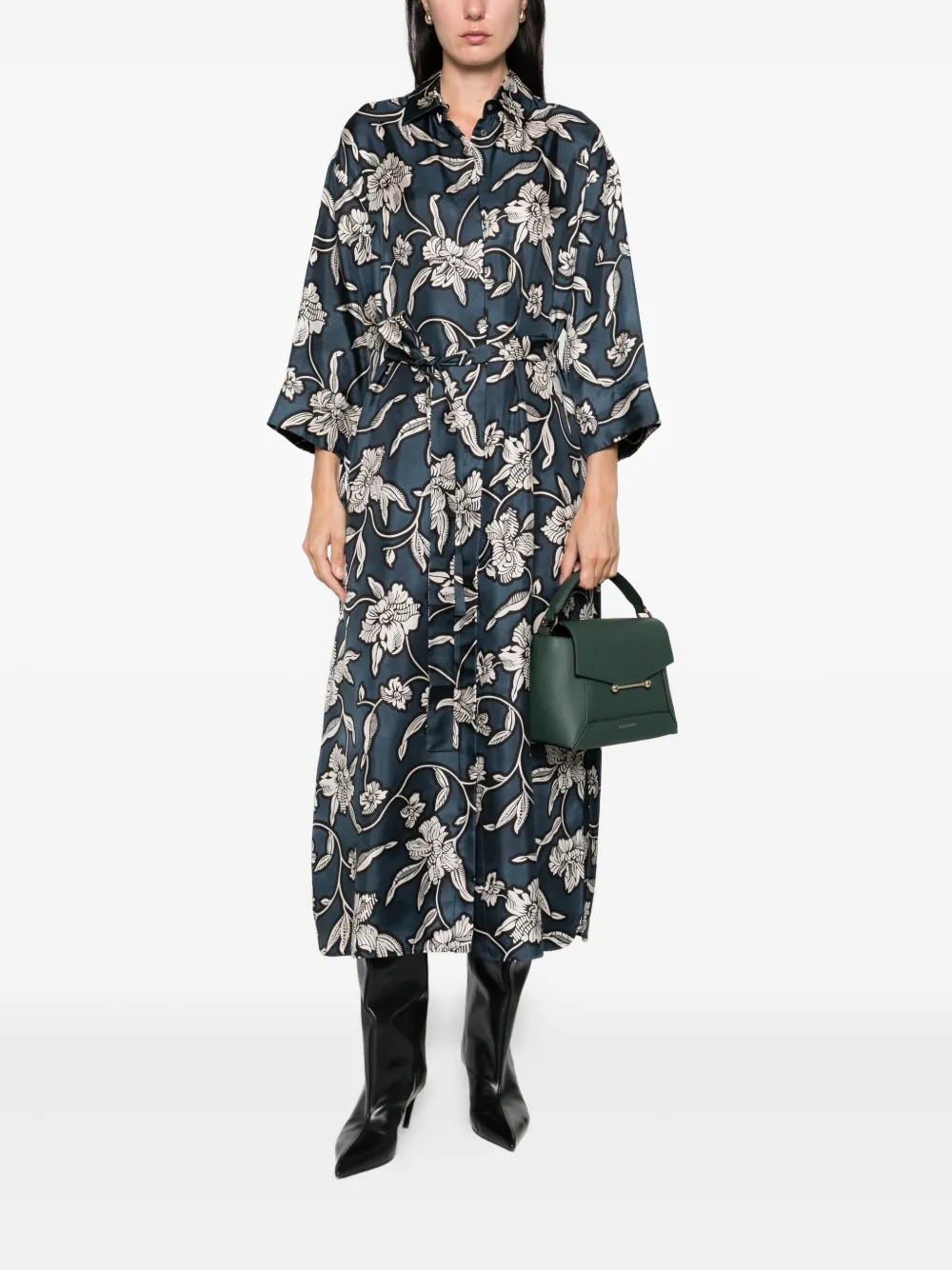 Синий цветочный принт, застежка на пуговицы, пояс-шнурок, короткие рукава, воротник-стойка