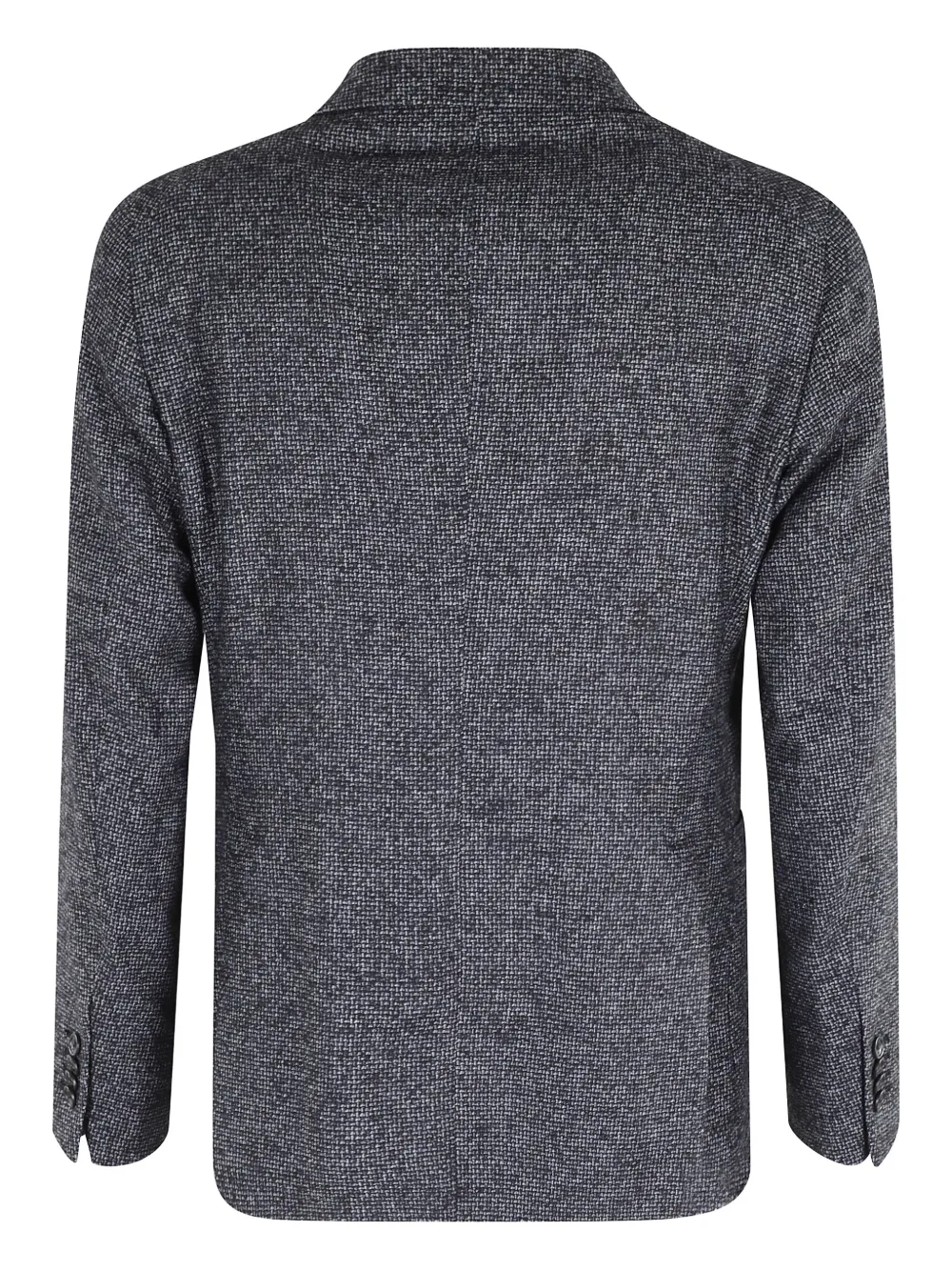 Синяя застежка на две пуговицы, манжеты на пуговицах, накладные карманы, отвороты с зазубринами, длинные рукава
