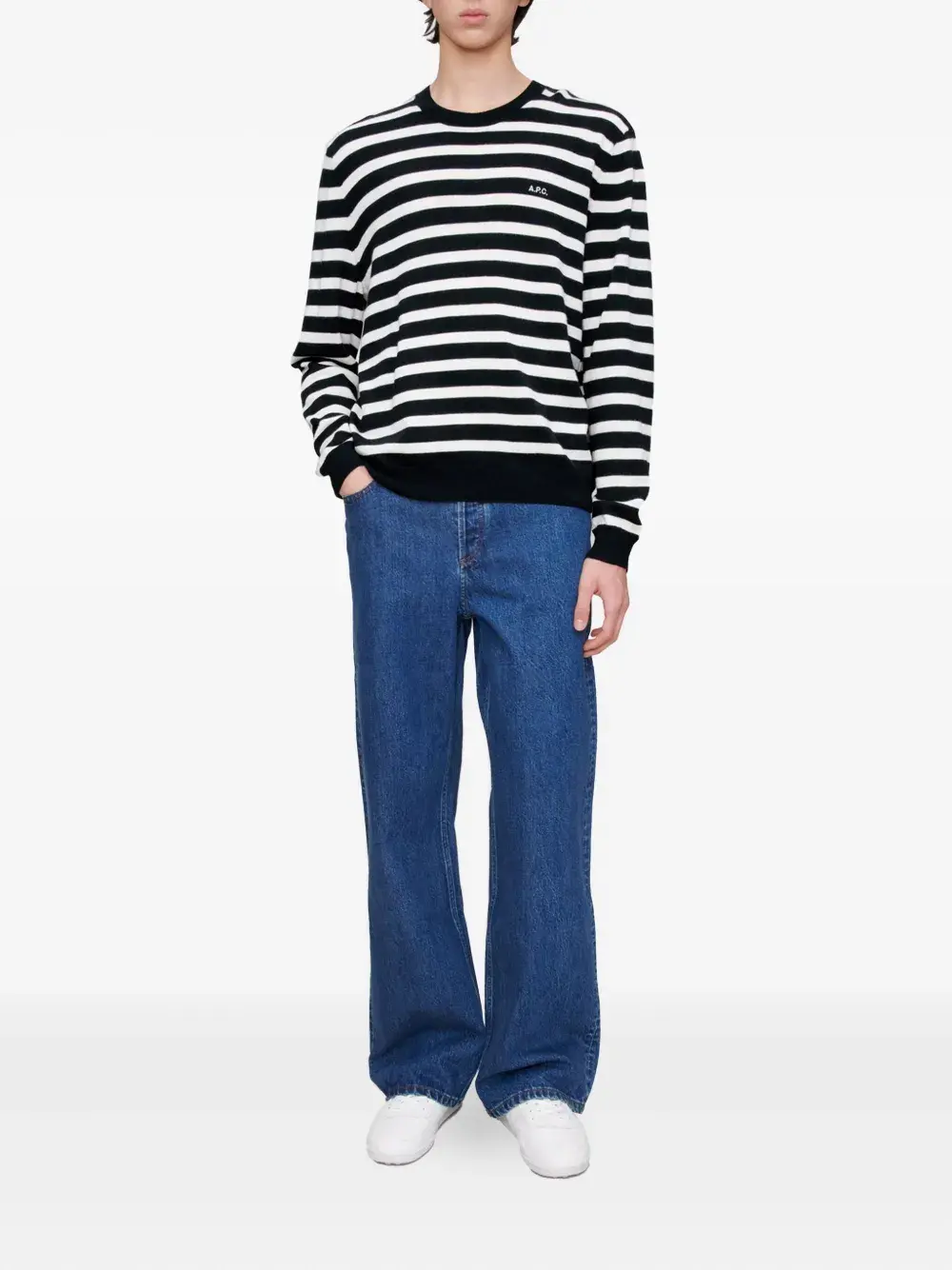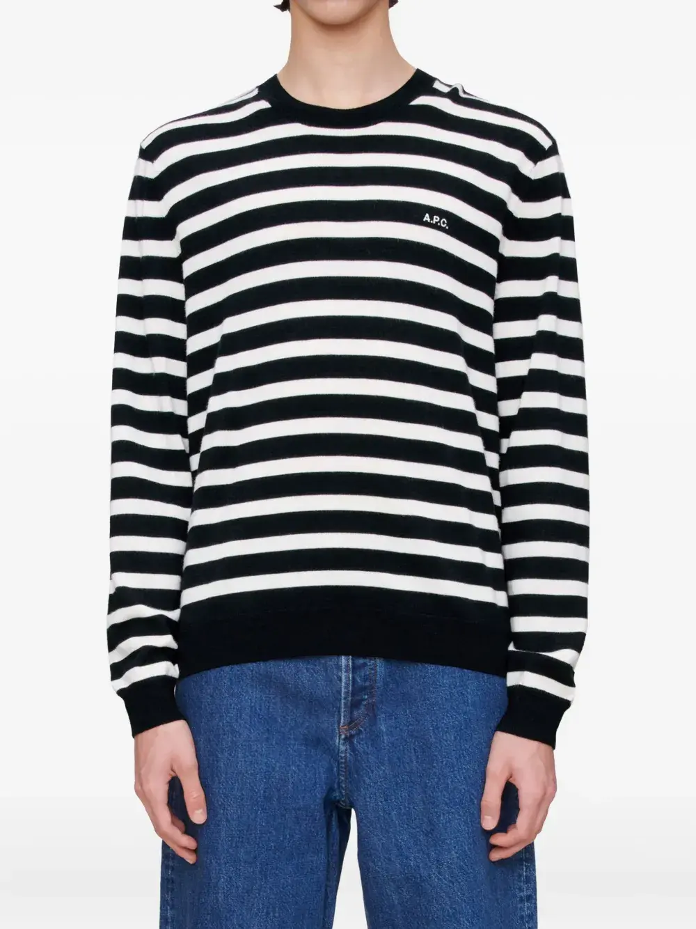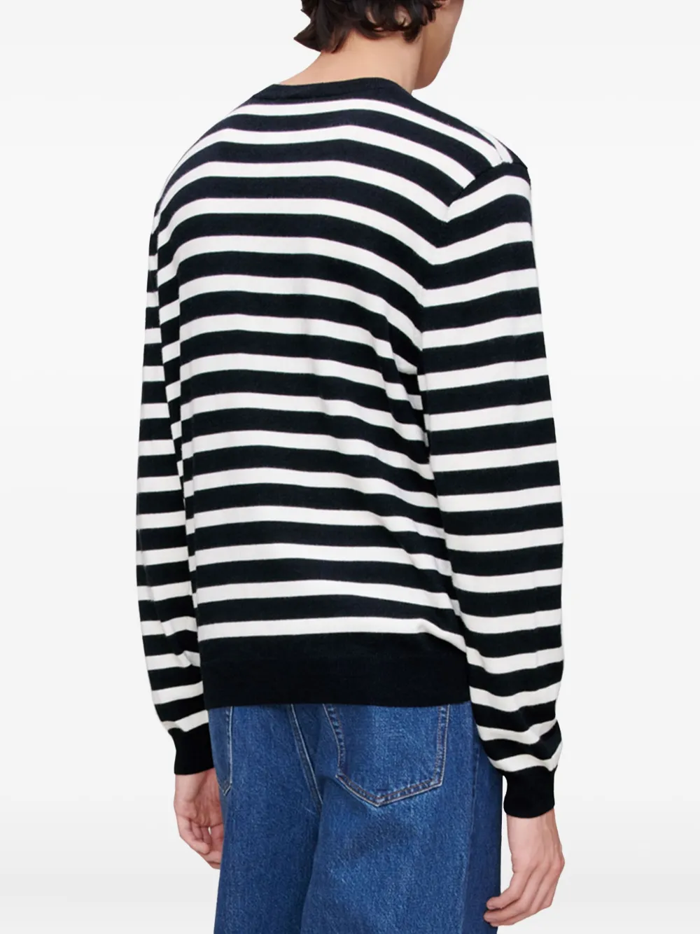 Темно-синий полосатый узор, круглый вырез горловины, длинные рукава, вышитый логотип