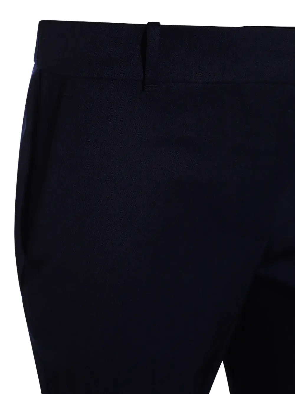 Темно-синяя потайная застежка спереди, прямые шлевки для ремня, боковые прорезные карманы
