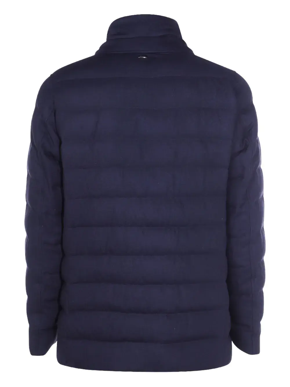 Темно-синий стеганый дизайн, застежка на пуговицы и молнию спереди, высокий воротник, боковые карманы с клапанами