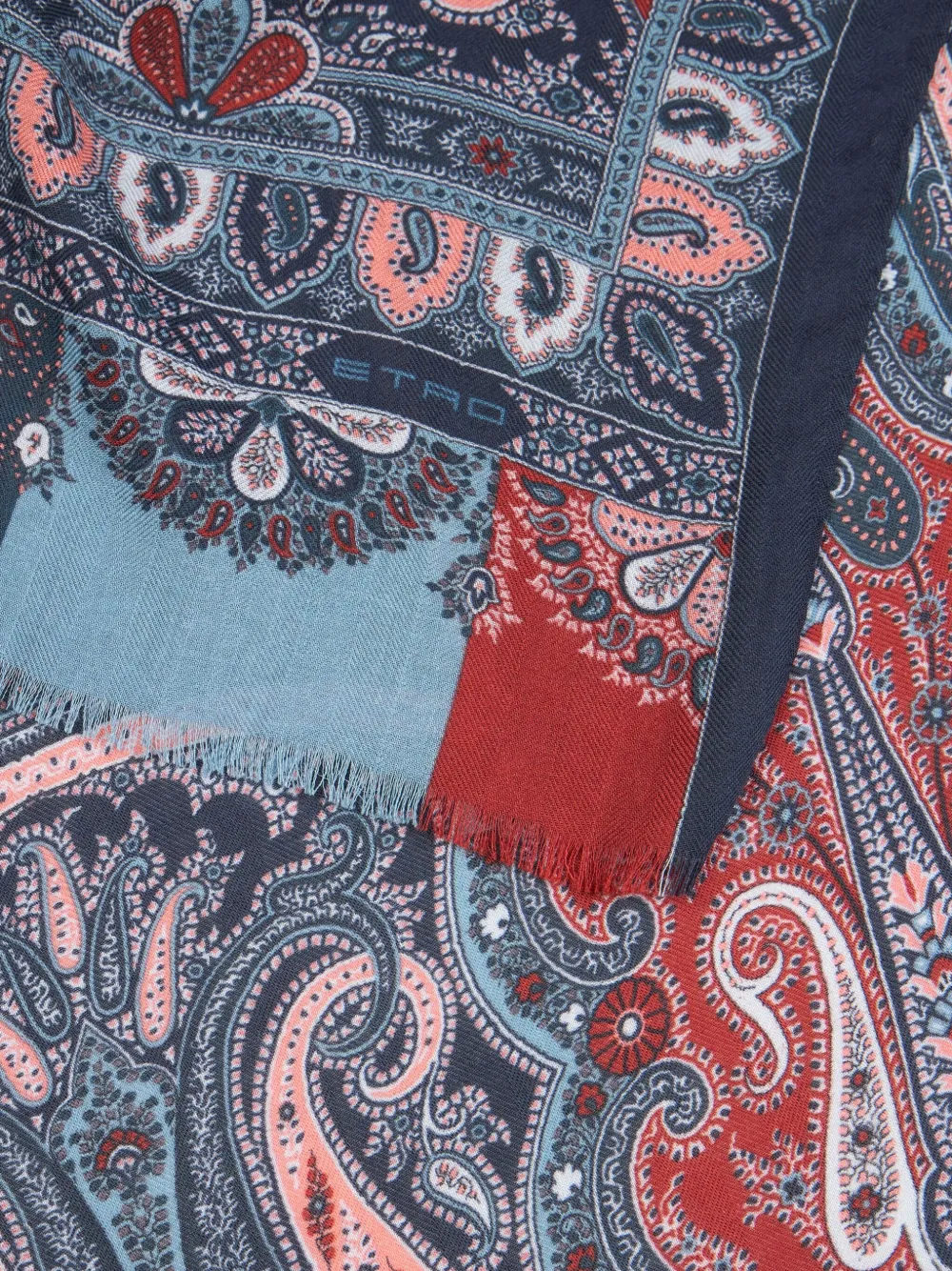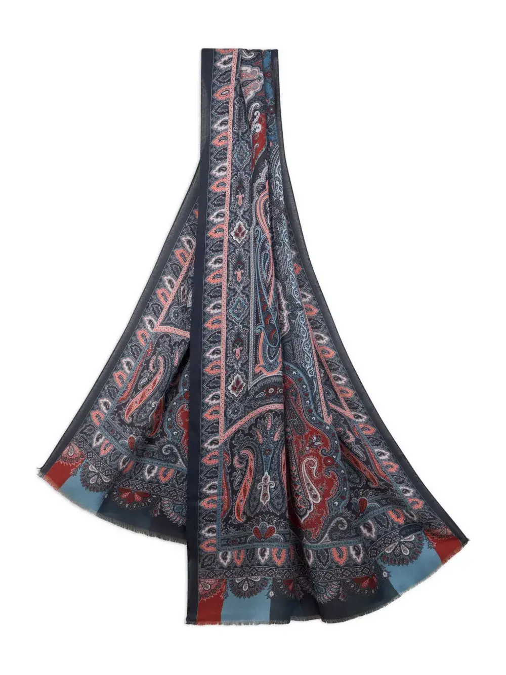 Темно-синий узор пейсли с красными/синими акцентами, бахрома по краям, смесь кашемира и шелка