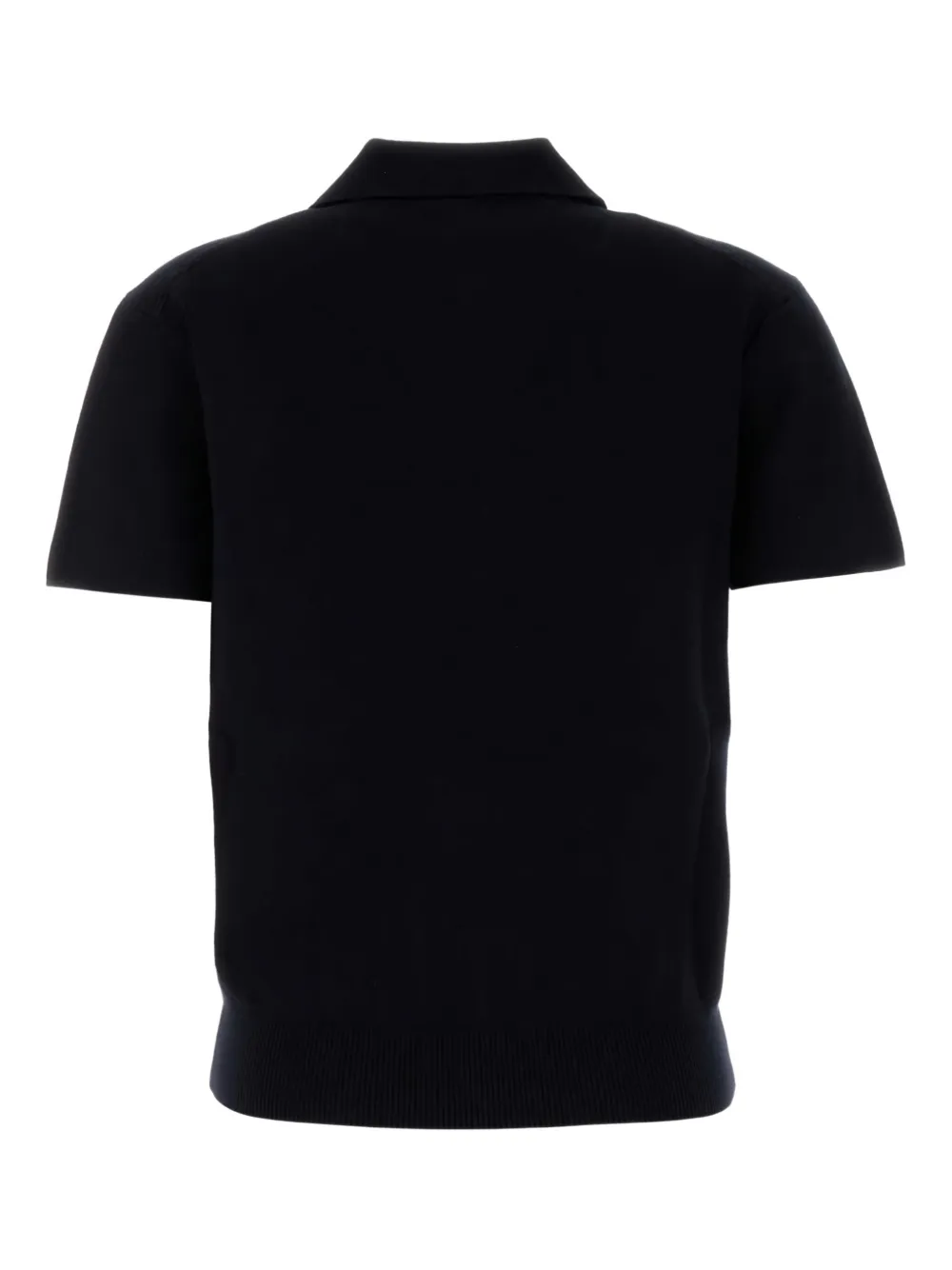 Темно-синие короткие рукава, воротник-поло, застежка-молния до середины бедра, ребристый подол, трикотажная ткань