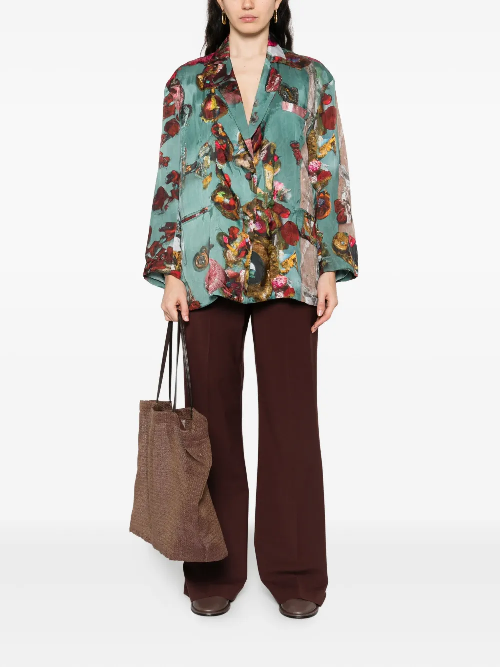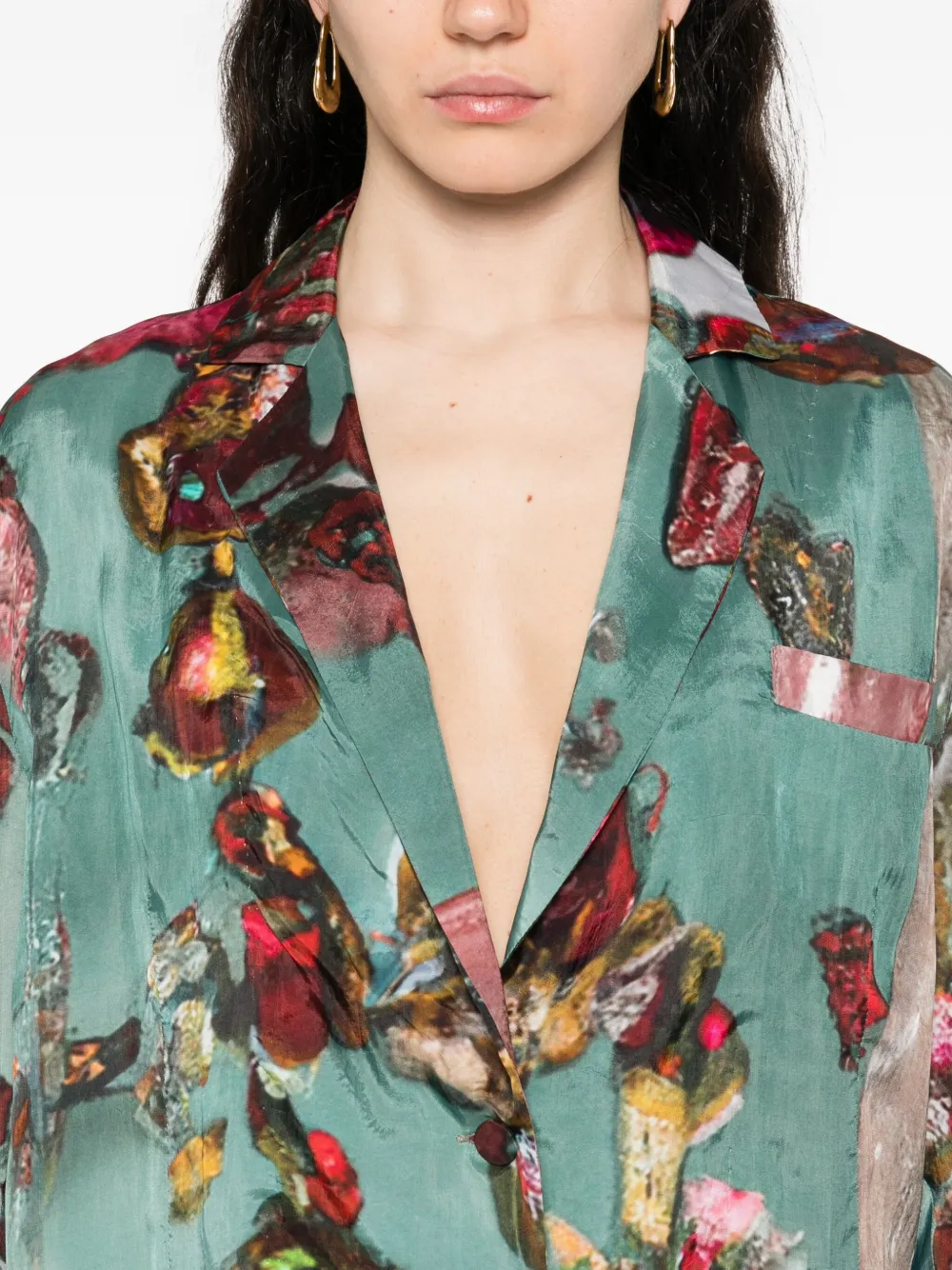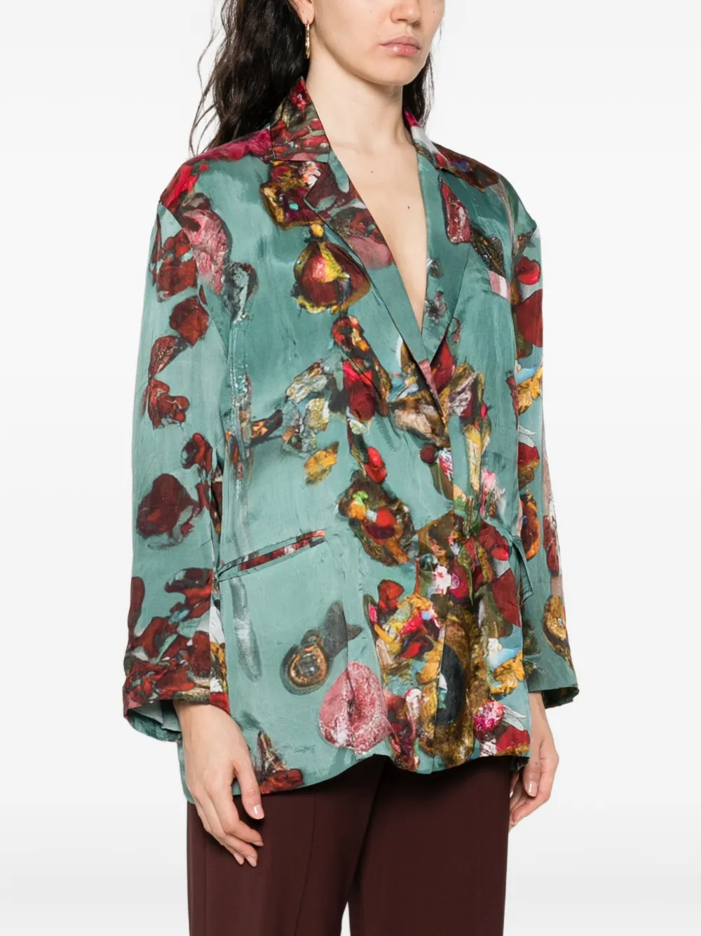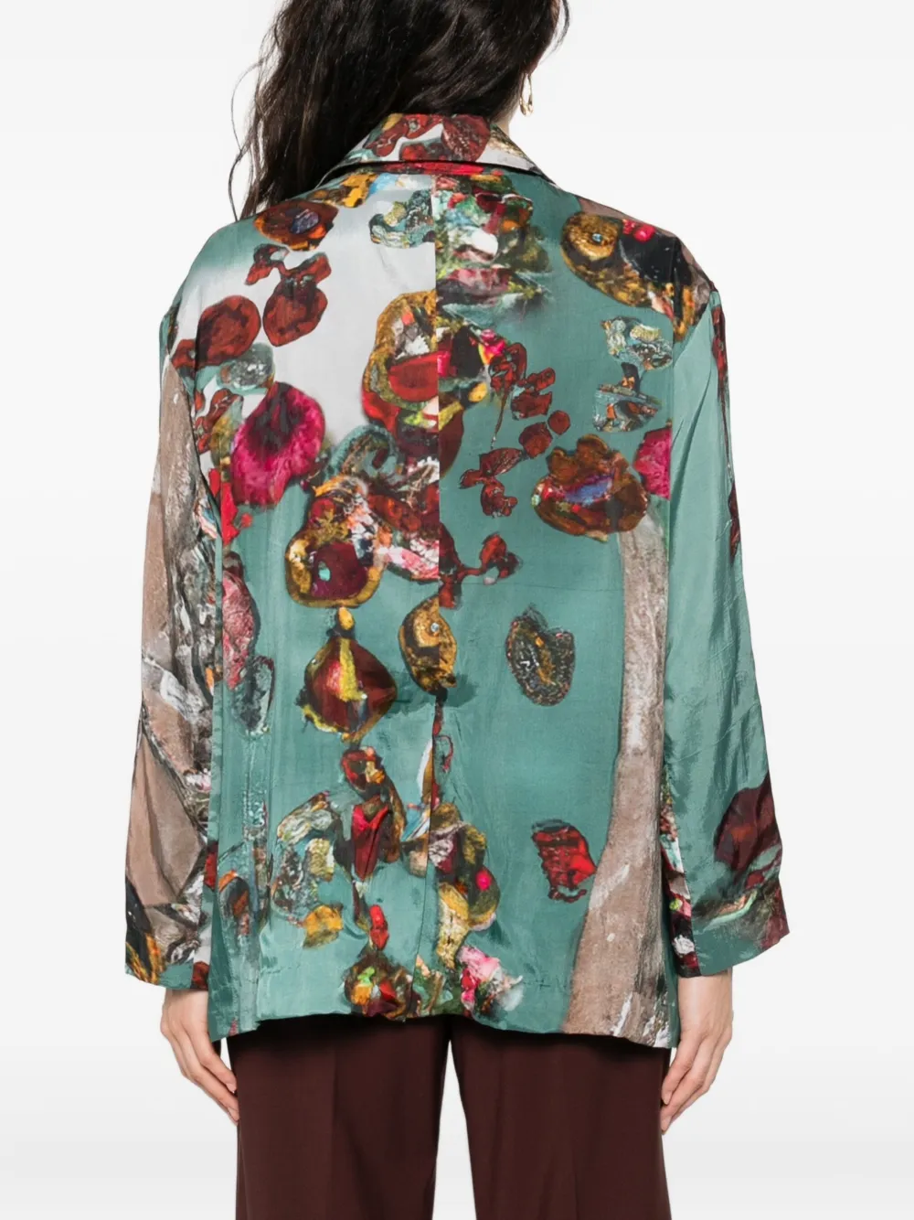 Синий цветочный принт, застежка на пуговицы, заостренные лацканы, длинные рукава, накладные карманы
