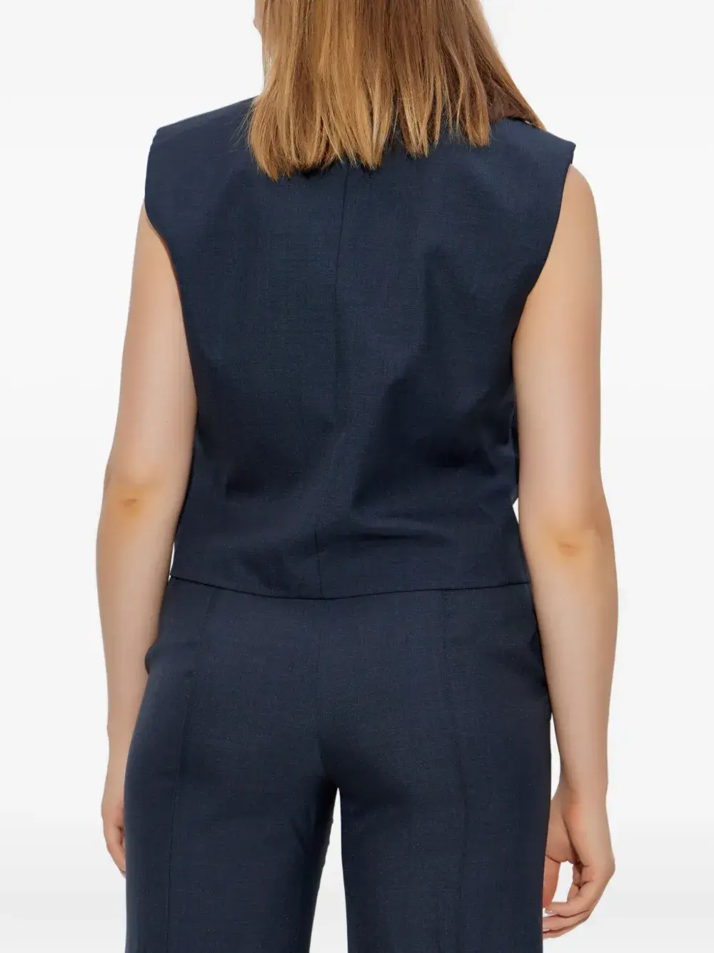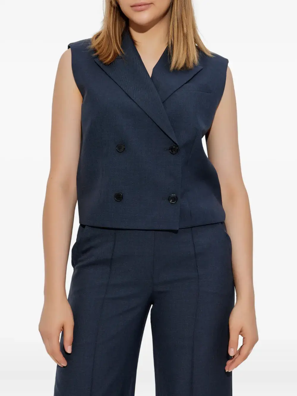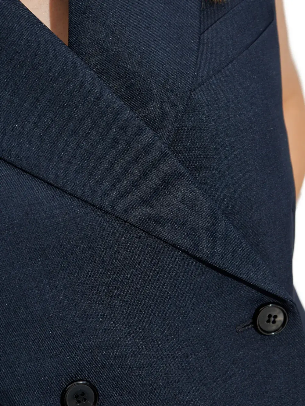 Темно-синий двубортный пиджак с застежкой на пуговицы, прорезным нагрудным карманом, острыми лацканами, без рукавов