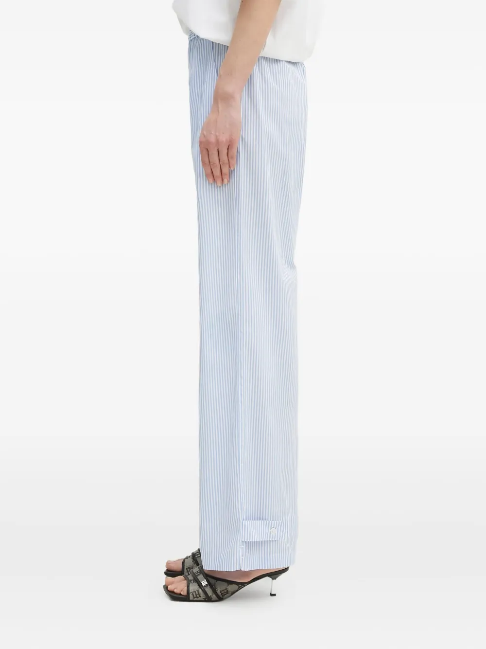 Светло-голубой узор в тонкую полоску, эластичный пояс, застежки на пуговицы, боковые карманы
