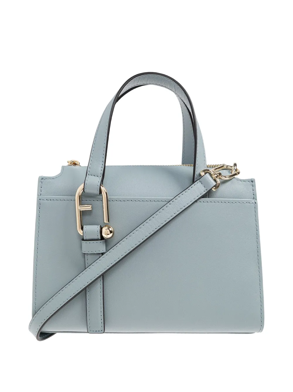Светло-голубые верхние ручки, съемный плечевой ремень, застежка-молния, золотистая застежка