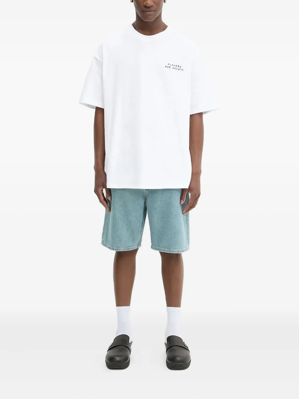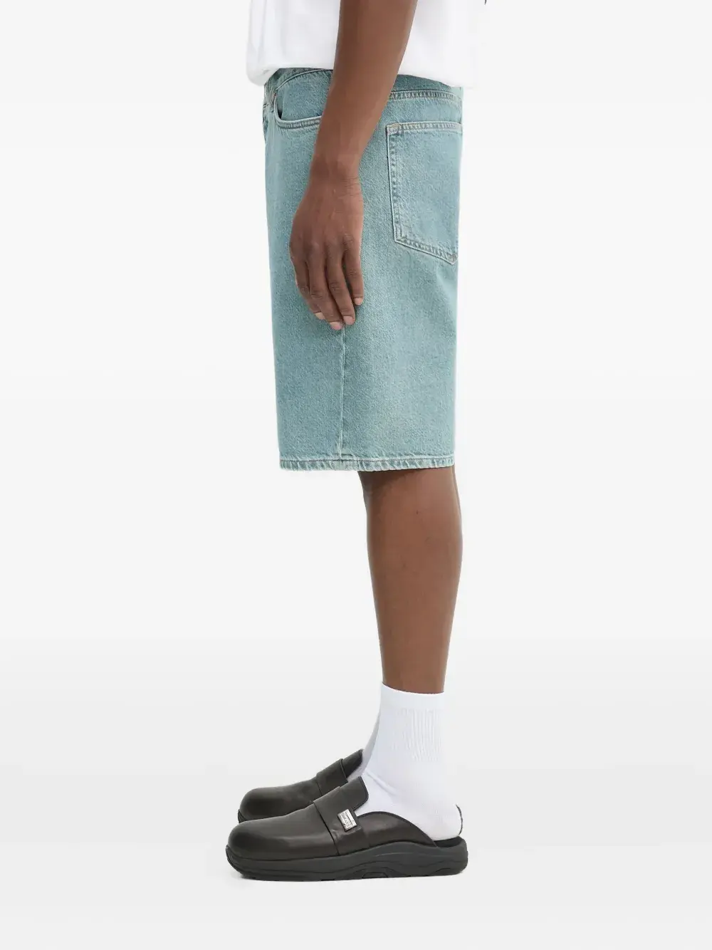 Светло-голубой органический хлопок, застежка на пуговицы и молнию спереди, классические пять карманов, шлевки для ремня, нашивка с логотипом сзади
