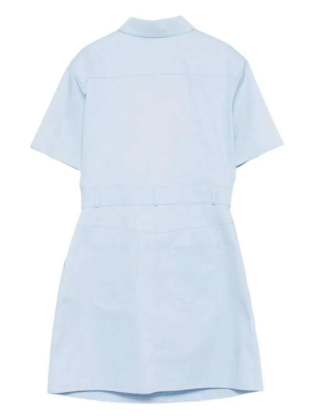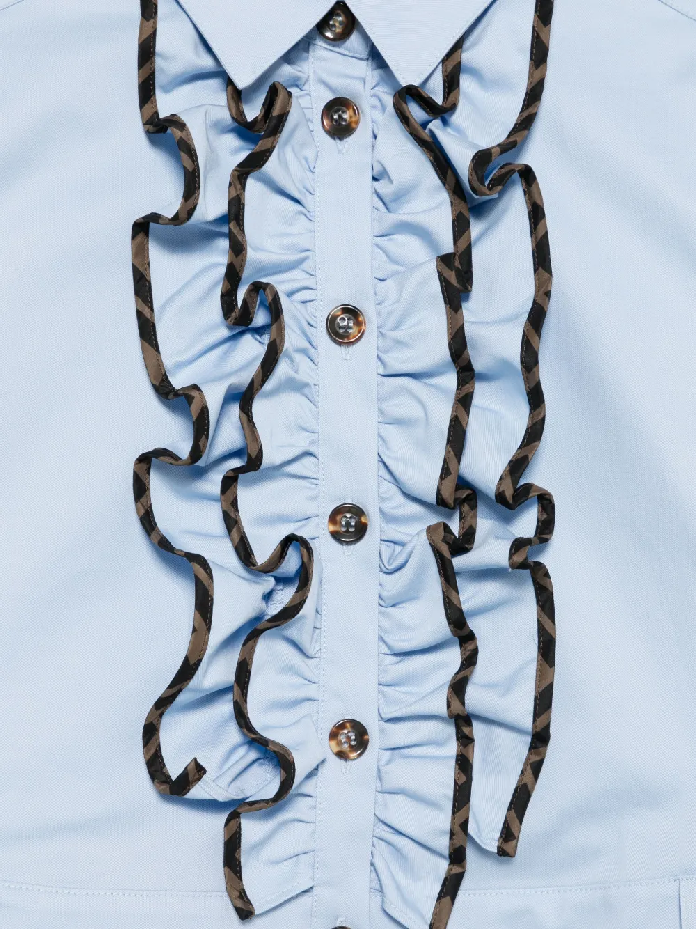 Светло-голубой перед с оборкой, короткие рукава, застежка на пуговицы, прорезной карман спереди, коричневая отделка