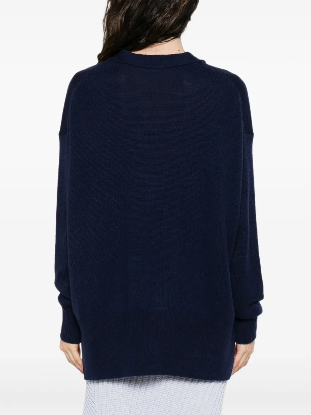 Темно-синяя кашемировая шерсть, V-образный вырез, застежка на пуговицы, длинные рукава, ребристая отделка