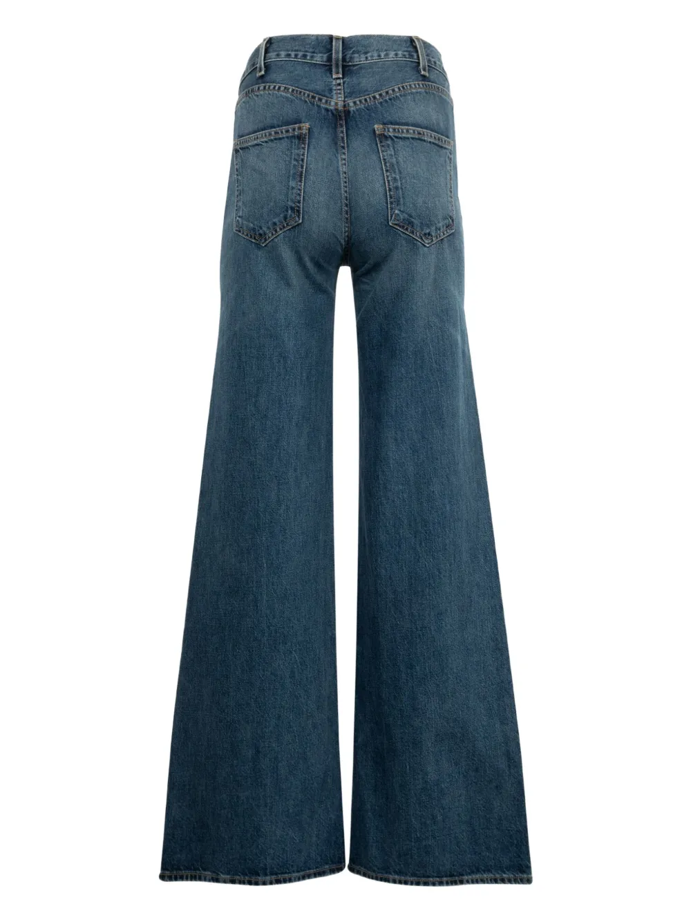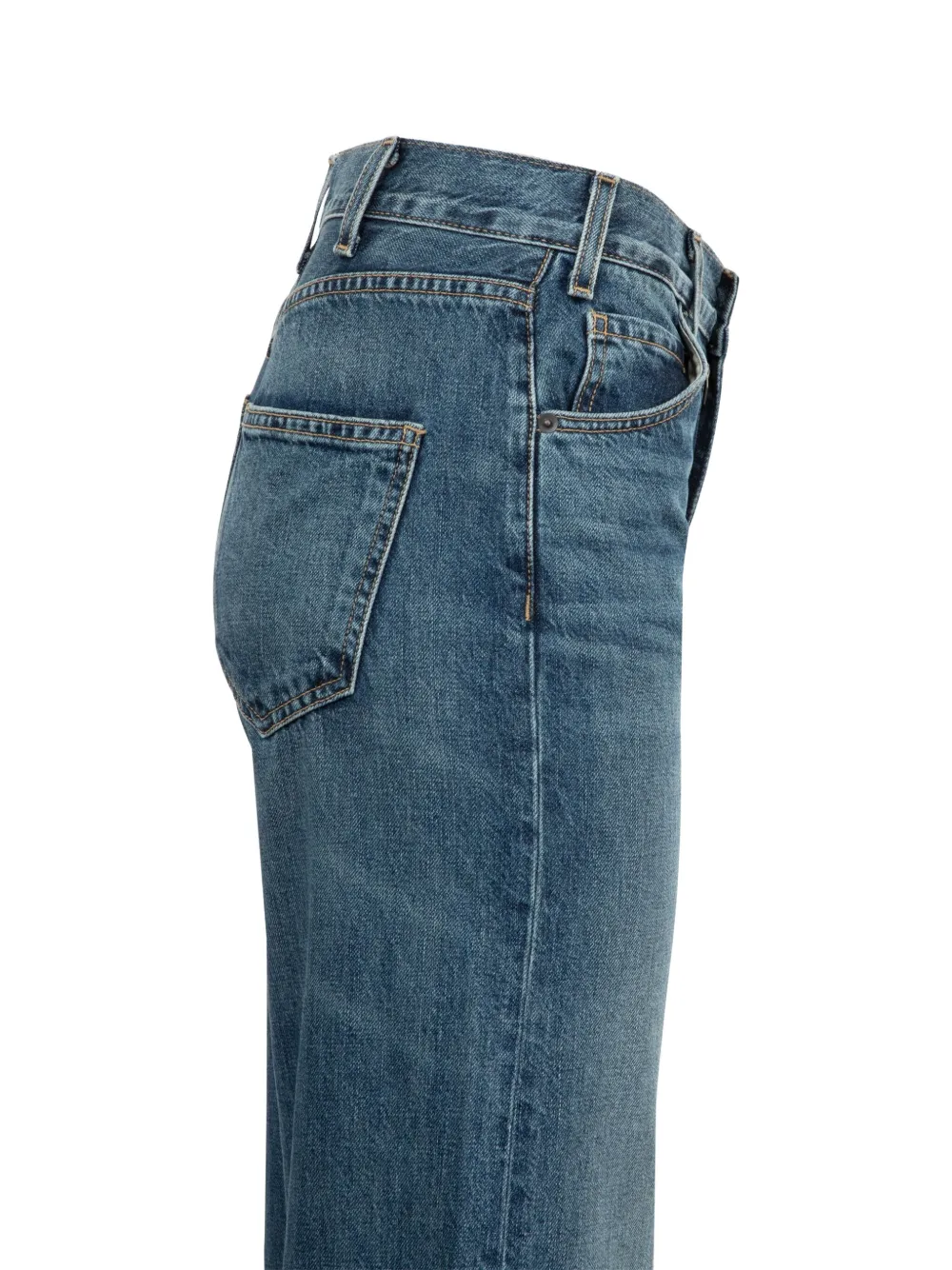 Синяя высокая талия, пять карманов, пуговицы, шлевки для ремня