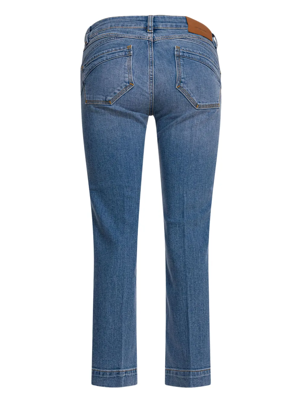 Синяя модель с пятью карманами, застежкой на пуговицы, шлевками для ремня и нашивкой с логотипом