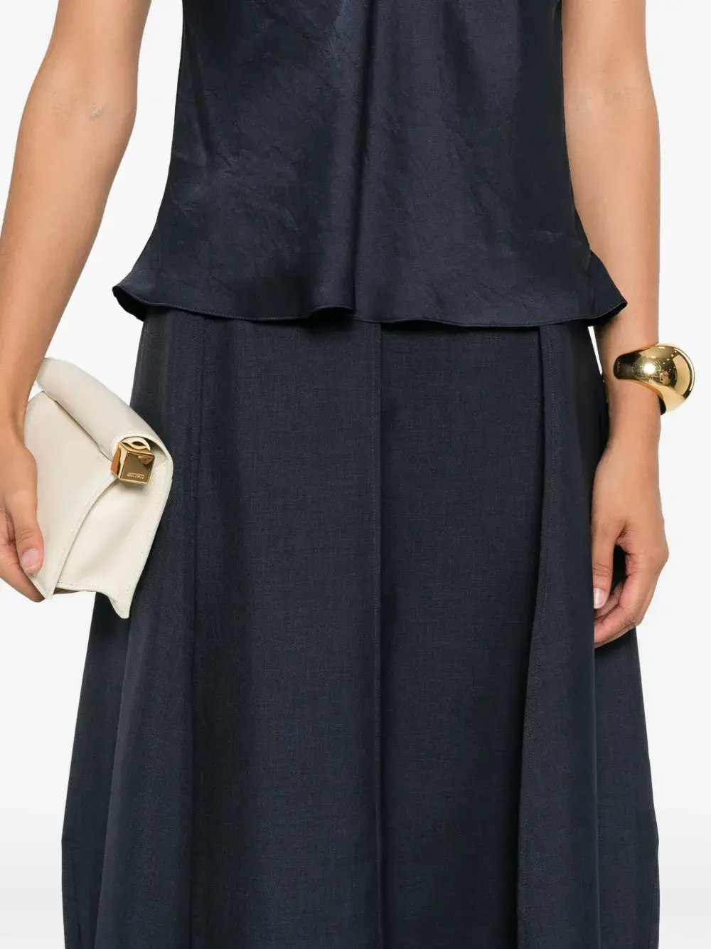 Темно-синие плиссированные детали, А-силуэт, длина миди, прямой подол, потайная застежка-молния