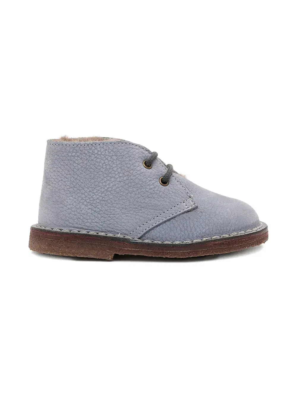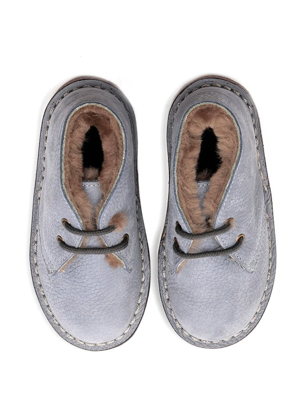Светло-голубая телячья кожа, меховая подкладка, шнуровка, кожаная подошва, отделка стежками