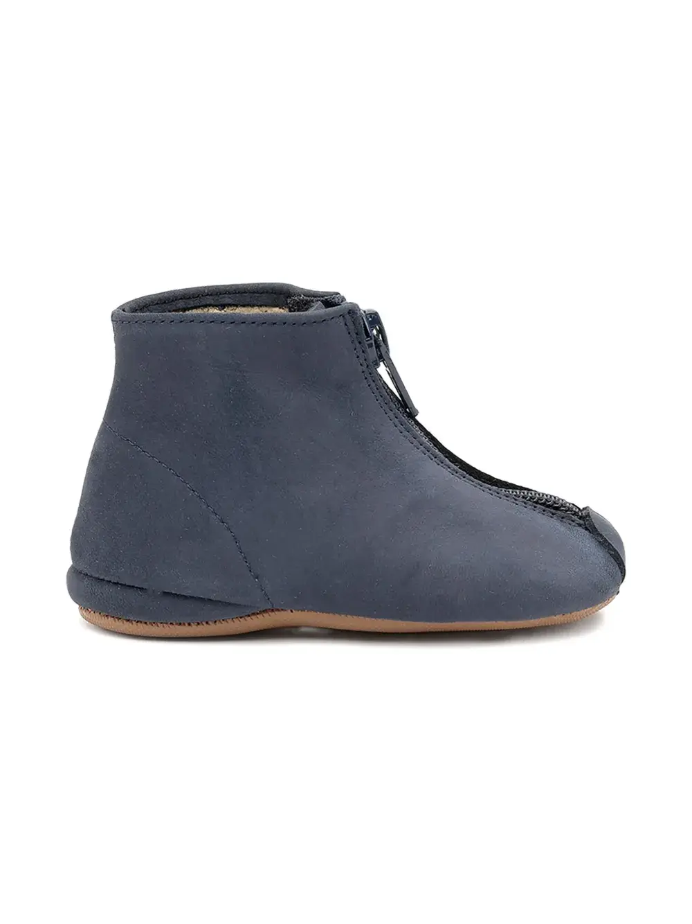 Темно-синяя телячья кожа, застежка-молния, круглый носок, плоская подошва, высота до щиколотки