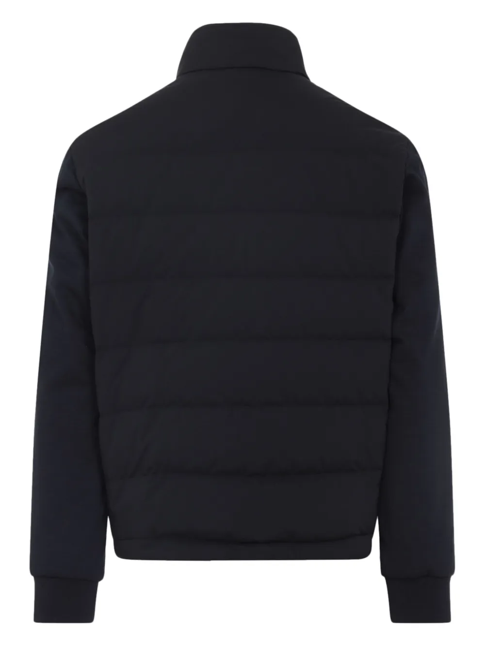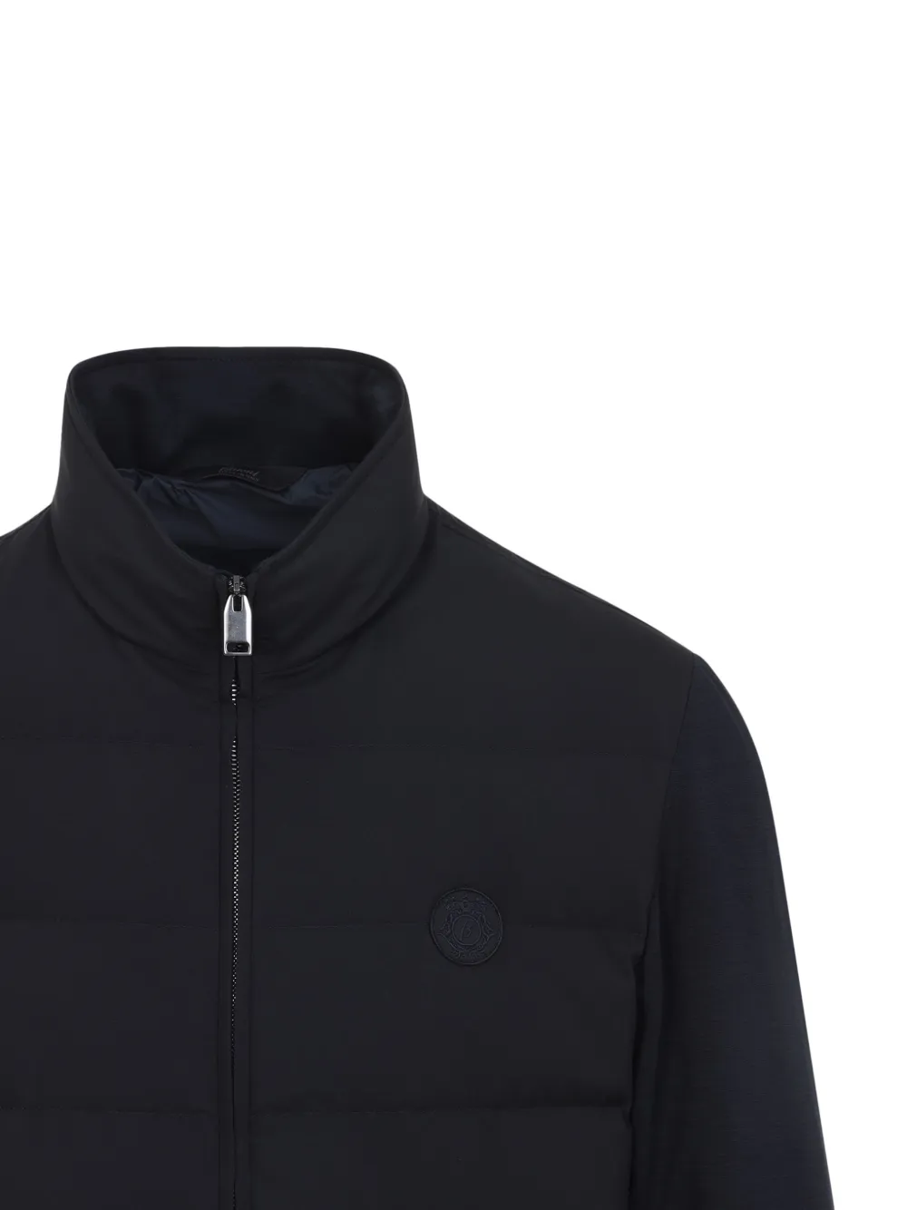 Темно-синего цвета, стеганый дизайн, высокий ворот, застежка-молния, аппликация с логотипом, ребристые манжеты